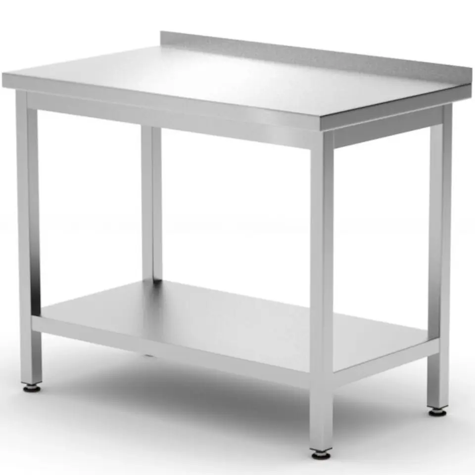 Kod producenta: 817261Stół gastronomiczny marki Hendi sprawdzi się w każdej restauracji, kuchni czy w laboratorium. Wykonany został ze stali nierdzewnej AISI 430. Blat został od spodu wzmocniony profilem wzdłużnym. Nogi wykonane są z profili 40 x 40 mm. Stół posiada półkę, która pozwoli przechować najpotrzebniejsze sprzęty kuchenne. Jej wysokość nie jest regulowana - odległość od podłogi do dolnej krawędzi półki wynosi 160 mm. Skręcana konstrukcja mebla umożliwia jego łatwe złożenie, magazynowanie czy przewożenie. Rant 40 mm zabezpiecza ścianę przed zabrudzeniem. Dopuszczalne obciążenie blatu i półki wynosi ok. 70 kg/m2. Stopki są regulowane w zakresie +25/-5 mm.Cechy produktu: