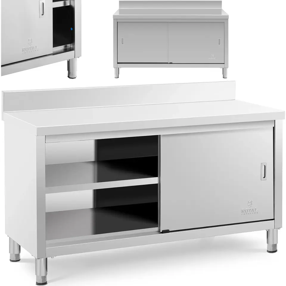 Kod producenta: 10011682Stół gastronomiczny marki Royal Catering sprawdzi się w restauracjach, hotelach, stołówkach, sklepach itp. Powierzchnia robocza wynosi 150 x 60 cm. Duża szafka z półką zapewnia dodatkową przestrzeń do przechowywania przyborów kuchennych. Zamykana jest przesuwnymi drzwiami, które zajmują niewiele miejsca, są bezpieczne w użyciu i zapewniają łatwy dostęp do wnętrza. Rant o wysokości 100 mm chroni ścianę przed zachlapaniem.Mebel wykonany został ze stali nierdzewnej, jest higieniczny, odporny na uszkodzenia, korozję i trwałe zabrudzenia. Jego konstrukcja wytrzymuje obciążenie do 600 kg.Cechy produktu: