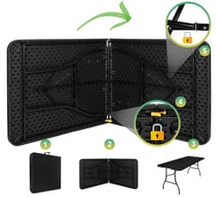 Stół cateringowy BALI BLACK składany w walizkę 180 cm⭐️ 100% Wodoodporny⭐️ Blat o grubości 3,5 cm⭐️ Składany w walizkę⭐️ Maksymalne obciążenie 150 kg⭐️ Zabezpieczenie przed złożeniem⭐️ Zakup od producenta ✨ Stół cateringowy Bali Black ✨☑️Kolor: CzarnyStół cateringowy Bali to doskonały wybór dla osób, które stawiają na funkcjonalność, trwałość i wygodę użytkowania. Jego innowacyjna konstrukcja pozwala na szybkie złożenie do formy praktycznej walizki, dzięki czemu świetnie sprawdza się podczas organizacji eventów, spotkań plenerowych czy targów. Stabilna i solidna budowa gwarantuje niezawodność przez długie lata, a gruby blat wykonany z odpornego na wilgoć tworzywa HDPE zapewnia wysoką wytrzymałość oraz udźwig do 150 kg. Wymiary:Długość 180 cmSzerokość 70 cmWysokość do górnej części blatu 74,5 cmWysokość do dolnej części blatu 71 cmGrubość blatu na obrzeżach 3,5 cmGrubość metalowej ramy 22 mmRozstaw nóg 57 x 150 cmWymiary złożonego stołu (walizki): 70 x 91 x 7 cm ✅ Składany w wygodną walizkęPo złożeniu stół przyjmuje formę walizki, co znacząco ułatwia transport i przechowywanie. A - Wygodna rączka do transportuB - Podkładki ochronneC - Blokada przed złożeniem blatuD - Blokada przed złożeniem stelaża ✅ Blokada przed złożeniem blatuStół wyposażony jest w praktyczną blokadę, która zapobiega przypadkowemu złożeniu blatu podczas użytkowania. ✅ Zabezpieczenia przed złożeniem stelażaZabezpieczenia na stelażu chronią przed przypadkowym złożeniem się konstrukcji. ✅ Innowacyjny projektCała konstrukcja mieści się w walizkę, dzięki czemu transport i przechowywanie są bardzo łatwe. ✅ Antypoślizgowe stopyNogi stołu zakończone są antypoślizgowymi stopami, dzięki czemu stół jest stabilny. W skład zestawu wchodzi opakowanie zewnętrzne - karton. Oznaczenia na kartonie mogą różnić się ze względu na różne serie dostaw. ❓Q&A (Pytania i odpowiedzi) ❓➡️ Czy stół Bali można użytkować na zewnątrz?Tak, stół cateringowy Bali jest odporny na wilgoć i wykonany z materiałów trwałych, co pozwala na jego użytkowanie zarówno wewnątrz, jak i na zewnątrz.➡️ Jaki jest maksymalny udźwig stołu?Maksymalne równomierne obciążenie stołu wynosi 150 kg, co zapewnia jego stabilność i wytrzymałość nawet przy intensywnym użytkowaniu.➡️ Czy stół jest łatwy do przenoszenia?Tak, dzięki możliwości składania w formę walizki i zastosowaniu wygodnej rączki, stół jest niezwykle łatwy do przenoszenia i transportu.➡️ Jakie są wymiary stołu po złożeniu?Wymiary stołu po złożeniu to 74 x 92,5 x 7 cm, co pozwala na łatwe przechowywanie nawet w niewielkich przestrzeniach.➡️ Czy stół posiada zabezpieczenia przed przypadkowym złożeniem?Tak, stół wyposażony jest w specjalne blokady zabezpieczające zarówno blat, jak i stelaż przed przypadkowym złożeniem.➡️ Czy stół wymaga montażu?Nie, stół jest gotowy do użycia bez dodatkowego montażu – wystarczy go rozłożyć.* Kolory przedstawione w ofercie należy traktować poglądowo - mogą odbiegać od rzeczywistych ze względu na różne ustawienia monitorów oraz proces obróbki zdjęć.* Uwaga! Rzeczywiste wymiary mogą się różnić od tych podanych w ofercie. Tolerancja błędów może wynosić +/- 5%.