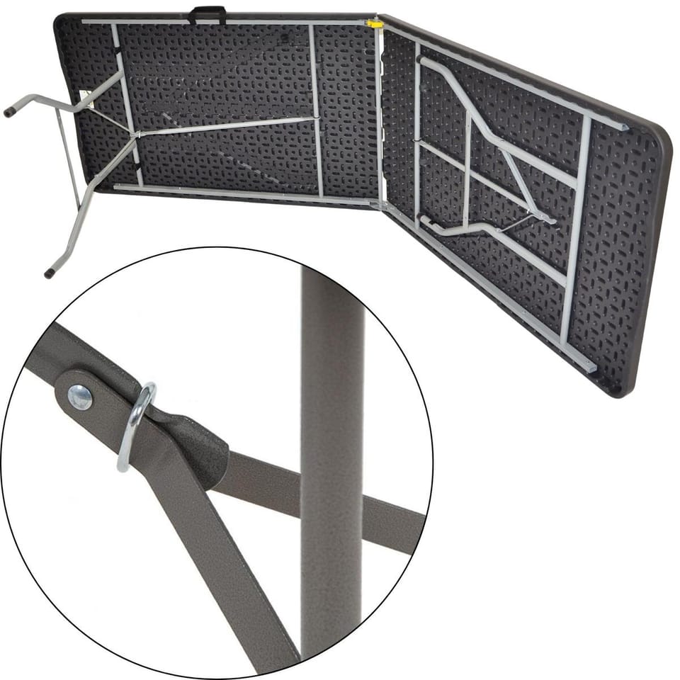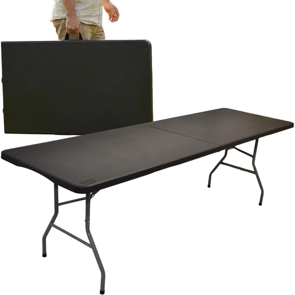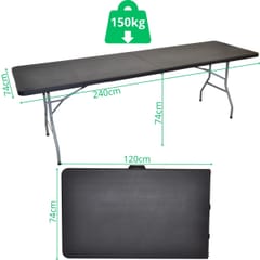 Parametry:- Wymiary stołu ok.: 240 x 74 x 74 cm (dł. x szer. x wys.)Wymiary złożonego stolika (walizka) ok.: 120 x 8 x 74 cm (dł. x gr. x wys.)Grubość profilu: rurka o średnicy 25 mm i grubości 0,9 mmMateriały: HDPE – blat, stal - nogi, plastik blokadaKolor: czarny blat, srebrny stelażMaksymalne obciążenie: 150 kgWaga netto: 15 kgWymiary opakowania (karton): 95 x 9,5 x 73 cm (szer. x gł. x wys.)