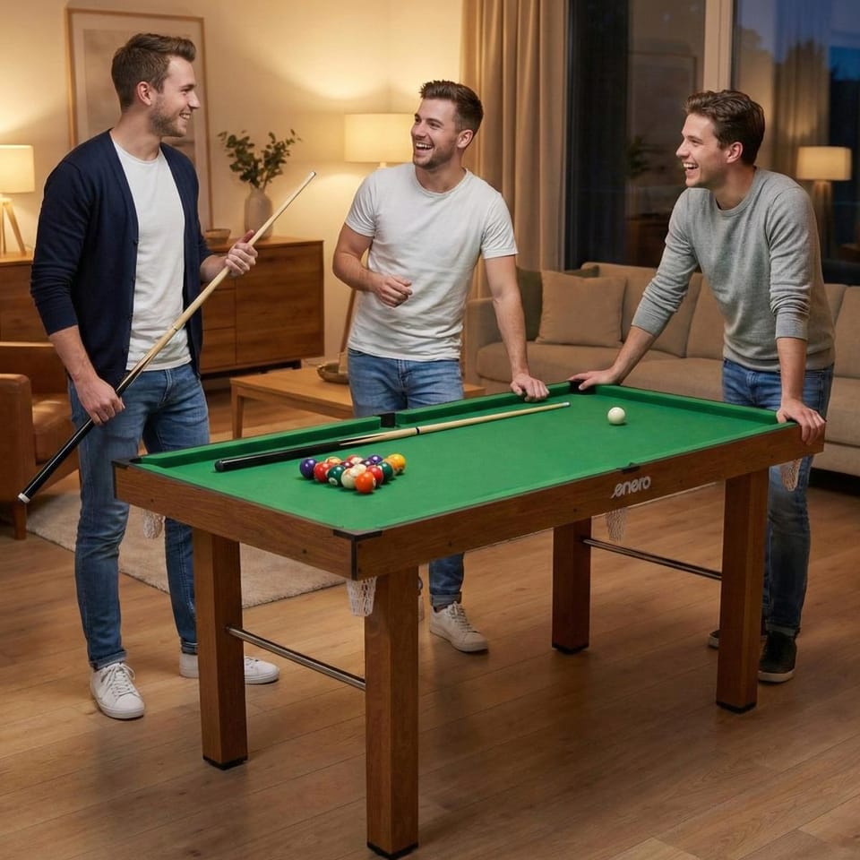 Wykonany z płyty MDF imitującej drewno z pokrytym, zielonym materiałem blatem charakteryzuje się eleganckim i klasycznym wyglądem. Takie wykończenie sprawia, że stół doskonale pasuje do różnych wnętrz, dodając im eleganckiego charakteru. Gra w bilard jest idealna do gry zarówno dla początkujących graczy, jak i dla tych, którzy cenią sobie rozrywkę w domowym zaciszu.