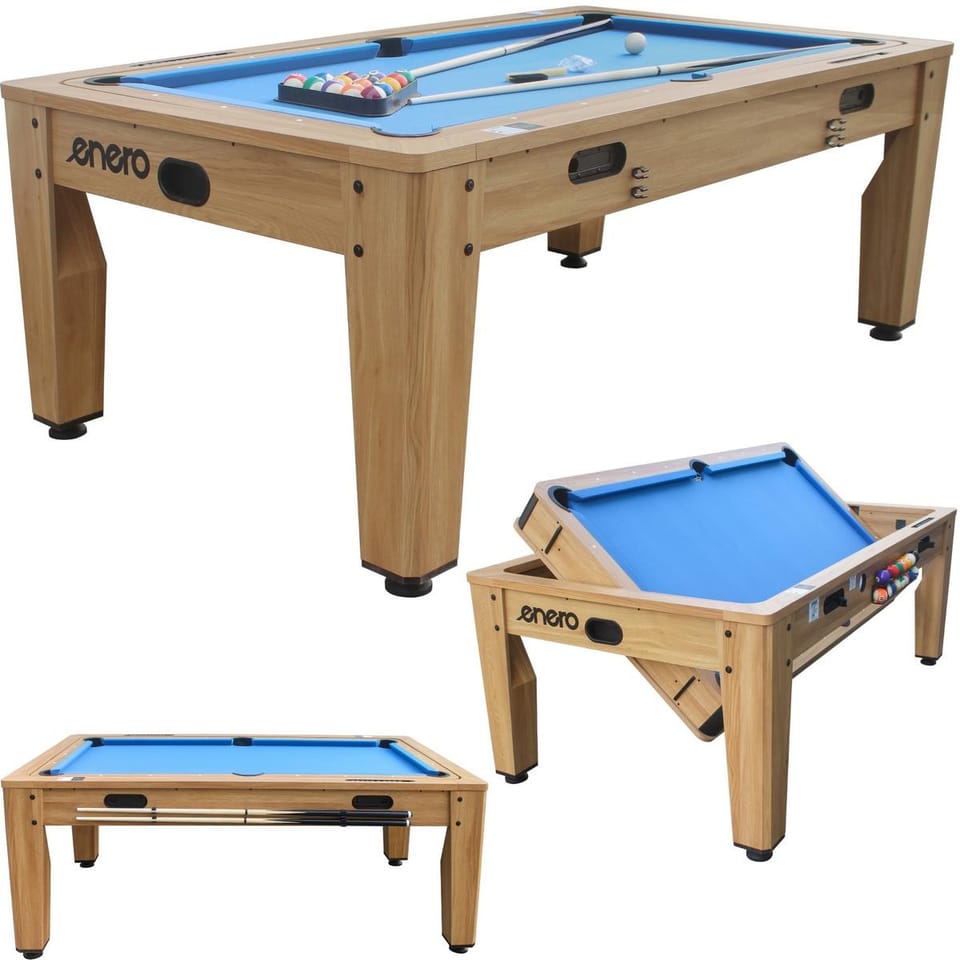 - Funkcje: stół bilardowy, stół do ping-ponga, stół do hokeja powietrznego, stół jadalnyWymiary całkowite stołu ok.: 214x121,6x81,3 cmPowierzchnia do gry w bilard ok.:177x84,6cmPowierzchnia do gry w unihokeja ok.:182x88,2cmMateriał pola do gry w bilard: MDF 18mm + faktura jak aksamitMateriał pola do gry w ping-ponga/jadalnię: MDF 12 mmMateriał pola do gry w hokeja powietrznego: płyta MDF 3+12+3 mmMateriał nogi: MDF o grubości 15 mmBlat stołu jadalnego/grubość blatu stołu do tenisa stołowego: płyta MDF 12 mmPoziomnice nóg: plastik 90 mmWentylator: tak, z tworzywa sztucznegoKolor dominujący: drewnopodobnyPozostałe materiały: drewno, stal, tworzywo sztuczneW zestawie: 1 zestaw bilardowych kul 2-1/4"; 1 szt. trójkąta plastikowego 2-1/4"; 1 szt. szczotki; 2 szt. kija 57"; 2 szt. kredy, 2 szt. rakiety; - 1 szt. siatki; 2 szt. zacisku siatki; 3 szt. piłeczki PP, 2 szt. plastikowego popychacza 96 mm; 6 szt. krążka 63 mm.Przeznaczenie: powyżej 14 roku życiaUżytkowanie: w warunkach domowychSposób konserwacji produktu: czyść lekko wilgotną szmatką, a następnie wytrzyj do suchaBlat obrotowy: takOpakowanie 2 kartony: 127,8x220,2x23,30cm/ 65x110x18,7cmMarka: Enero