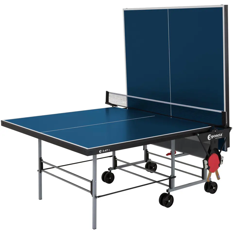 Rozgrywaj rekreacyjne mecze ping-ponga z solidnym stołem od renomowanego producenta! STÓŁ DO TENISA STOŁOWEGO SPONETA S3-47i niebieski pozowli Ci osiągnęć poziom MistrzaSprzęt jest idealny do aktywnego spędzania wolnego czasu gry rekreacyjnej dla dwóch lub jednej osoby tylko wewnątrz pomieszczeń. Dzięki funkcji złożenia stołu do treningu jednoosobowego, możesz ćwiczyć szybkość niezbędną w klasycznej grze.Stół S3 – Line Indoor klasy C, dzięki odpowiednio wysokiej jakości i trwałości, doskonale nadaje się do sportów rekreacyjnych. Może być wykorzystany także przez osoby początkujące, tylko w pomieszczeniach zamkniętych.Do produkcji stołu SPONETA S3-47i niebieski LINE INDOOR wykorzystano 3tecWood premium - specjalnie skonstruowaną płytę wykonaną z wiór drzewnych. Warstwy zewnętrzne są szczególnie drobne i mocno zagęszczone, dzięki czemu umożliwiają optymalne pokrycie powierzchni. Struktura płyty zapewnia stabilną i stabilną wymiarowo powierzchnię z produkcji przyjaznej dla środowiska, posiadającą certyfikat PEFC. W zakładzie w Schlotheim powierzchnia ta jest uszlachetniana w trzech powtarzających się etapach produkcji poprzez nałożenie kilku warstw podkładu, farby i lakieru.• W zestawie: stół, siatka w kolorze czarnym, Instrukcja montażu• Boczne uchwyty na piłkę i rakiety• Marka: Sponeta / Linia: Sportline Indoor•Stół wyłącznie wewnętrzny, nieodporny na warunki atmosferyczne• nadaje się tylko do suchych pomieszczeń wewnątrz budynku• zgodny z normą EN-14468• do aktywnego spędzania wolnego czasu• posiada certyfikat TÜV potwierdzający, wysoki standard w zakresie bezpieczeństwa• posiada certyfikar FSC• nieodporny na ciepło, zimno, bezpośrednie działanie promieni słonecznych i wilgoć (wilgotność względna powyżej 60%), czyli nie może być przechowywany w piwnicach, na altanach czy pomieszczeniach ze szkalnym dachem itp.• klasa CParametry: • Wymiary: długość 274cm / szerokość 152,5cm / wysokość 76 cm (oficjalny światowy standard)• Wymiary do przechowywania: długość 159 cm / szerokość 65 cm / wysokość 187 cm• Waga brutto: 76,5 kg• Waga netto: 71 kg• Blat:- Płyta wiórowa 3 tec WOOD 19 mm - Kolor: niebieski- Wielokrotnie powlekany- Profil ramy L-36 mm, powleczony proszkowo - Kolor profilu ramy: czarny (RAL 9011)• Podstawa:- Typ 4a (Automatic) - Ruchomy model z podstawą i dwoma oddzielnymi skrzydłami, każde może być niezależnie składane. Wymiary do przechowywania: ok. 40 x 190 cm. Sztaba bezpieczeństwa blokuje przypadkowe złożenie stołu. - Kwadratowy profil 25x25 mm, powleczony proszkowo - 4 podwójne, skrętne koła o średnicy 125 mm- Po obu stronach uchwyty na rakietki oraz piłeczki.- Kolor stelażu: szary (RAL 7040)- Prosty mechanizm blokujący: System na hak (Hook System)• W zestawie: stół, siatka w kolorze czarnym, Instrukcja montażu• Marka: Sponeta / Linia: S3 Line Indoor• zgodna z normą EN-14468 – 1
