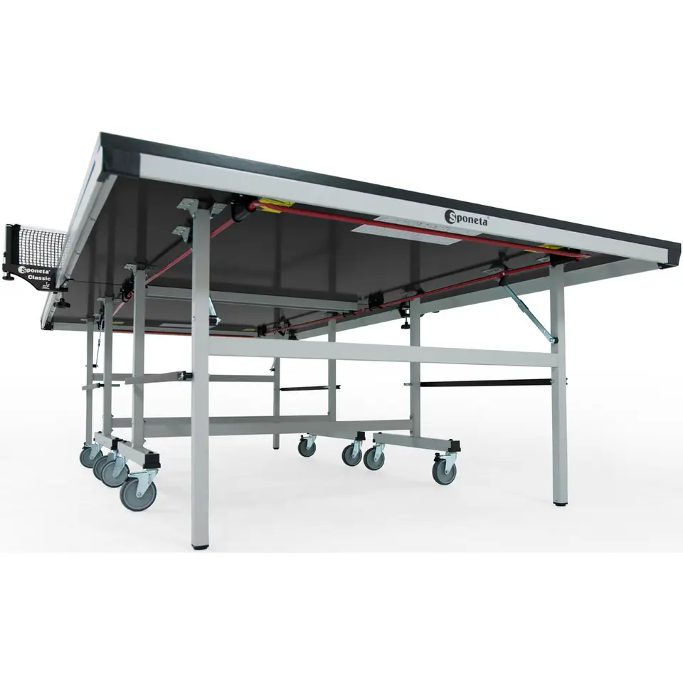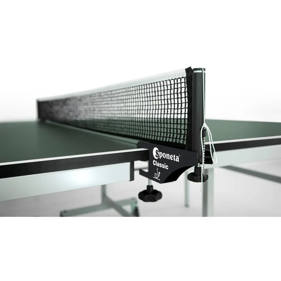 • Z serii S6 Activeline Indoors klasy B• zgodny z normą EN 14468-1• Posiada certyfikat PEFC• Idealny do intensywnych treningów i nie tylko• o zwiększonej stabilności powierzchni gry dzięki łącznikom płytkowym• kompensacja nierówności i różnych wysokości stojaka do 30 mm za pomocą regulatorów wysokości na tylnych nogach• W zestawie wysokiej jakości siatka typu "World Champion" w kolorze czarnym z solidnym słupkiem i metalową lamówką• Stół wewnętrzny, nieodporny na warunki atmosferyczne• Nadaje się tylko do suchych pomieszczeń wewnątrz budynku • Nieodporny na ciepło, zimno, bezpośrednie działanie promieni słonecznych i wilgoć (wilgotność względna powyżej 60%)Parametry: • Wymiary: długość 274cm / szerokość 152,5cm / wysokość 76 cm• Wymiary do przechowywania: długość 172 cm / szerokość 152,5 cm / wysokość 60cm • Waga brutto: 106,5 kg • Waga netto: 95,5 kg• Klamra: czarna (RAL 9011) • Przeznaczony do pomieszczeń zamkniętych, nieodporny na ciepło i zimno oraz promienie słoneczneProfil ramy• Płyta wiórowa 3tecWOOD 22 mm• Kolor: zielony• Wielokrotnie powlekana• Profil ramy A-40 mm, powlekany proszkowo • Kolor profilu ramy: jasnoszary (RAL 7035)• Kolor stelażu: jasnoszary (RAL 7035)Stelaż• Semi-Compact (typ 3)• Kwadratowy profil 30 x 30 mm / 40 x 40 mm• 4 skrętne koła o średnicy 100 mm z bieżnikiem gumowym na każdym blacie, 2 z blokadą• Regulacja nóżek (do 30mm) pozwala na zachowanie równowagi stołu na nierównych powierzchniachBlokowania• Uchwyt z metalową rączką pod stołem odblokowuje jednocześnie oba zabezpieczenia • Prosty i automatyczny mechanizm blokującySiatka• z solidnym słupkiem siatkowym i metalową lamówką• z regulacją wysokości • powlekana tworzywem sztucznym w kolorze czarnym• bawełniana typu "World Champion" w kolorze czarnym• z linką napinająca z łańcuszkiem do napinania górnej krawędzi siatki• wymiary ok.180 x 15,2 cm szer. x wys.• W zestawie: siatka ("Weltmeister'') w kolorze czarnym, Instrukcja montażu• Marka: Sponeta / Linia: Sponeta Activeline Indoors seria S6Link do montażu stołu: https://www.sponeta.de/produkt/s-6-13-i-226-7420-l/TOWAR WRAŻLIWY NA USZKODZENIA W TRANSPORCIE, PROSZĘ O SPRAWDZENIE PACZKI PODCZAS ODBIORU PRZY KURIERZE.Sponeta to Niemiecka marka zajmująca się produkcją stołów i akcesoriów do tenisa stołowego, której produkty są dostarczane do 90 krajów. Wieloletnie doświadczenie oraz doskonałe opinie dają gwarancje zadowolenia z zakupu. Produkty firmy Sponeta są cenione zarówno przez profesjonalistów jak i amatorów tenisa stołowego.