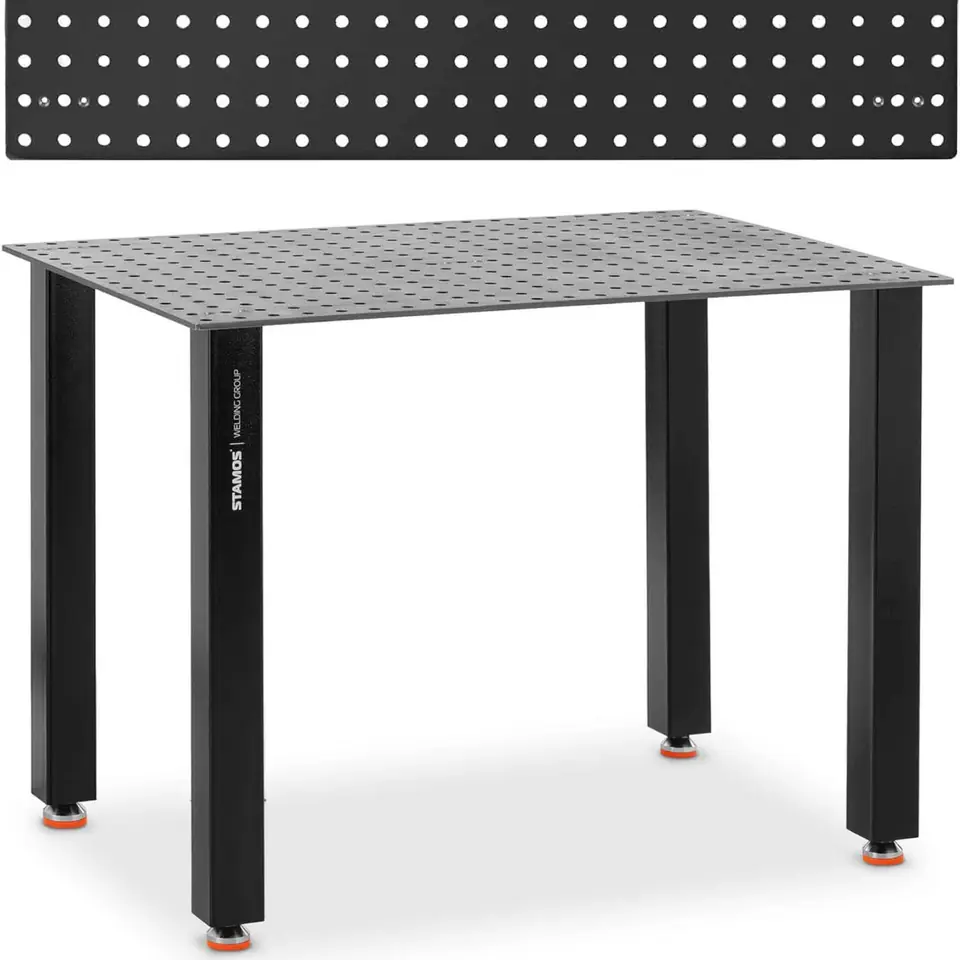 Kod producenta: 10021467 Stół spawalniczy marki STAMOS Germany wykonany z solidnej stali (Q345C/Q235), z blatem roboczym o powierzchni 120 x 80 cm i grubości 6 mm nie chybocze się, ani nie drga nawet podczas spawania z pełną mocą. Perforowana płyta stalowa została osadzona na czterech wyjątkowo mocnych nogach o wymiarach 80 x 80 x 885 mm. Dodatkową stabilność zapewnia możliwość regulacji wysokości nóg nawet o 50 mm i kompensować nierówności podłoża. Otwory w blacie służą do przymocowania i precyzyjnego wyrównania obrabianych przedmiotów. Stabilna konstrukcja utrzymuje przedmioty o łącznej wadze do 100 kg. Cechy produktu: