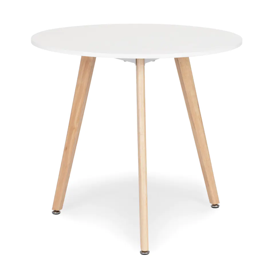 The table legs are made of durable wood, and feature special adjustable feet, which help to level the table and prevent scratches on the floor. The top is made of MDF board coated with a resistant veneer in matte white, and underneath is a metal frame in which the table legs are set.