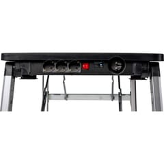- Stół wyposażony w: 3 gniazda elektryczne, samopoziomujące nakładki na nogi stołu, wyjmowaną tackę narzędziową oraz hak, uchwyt 2w1, uchwyt do holowania, otwory do montażu ścisków , kątownik i liniał oraz blokady obrabianego materiału