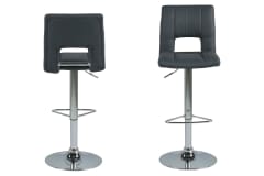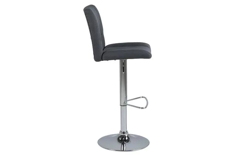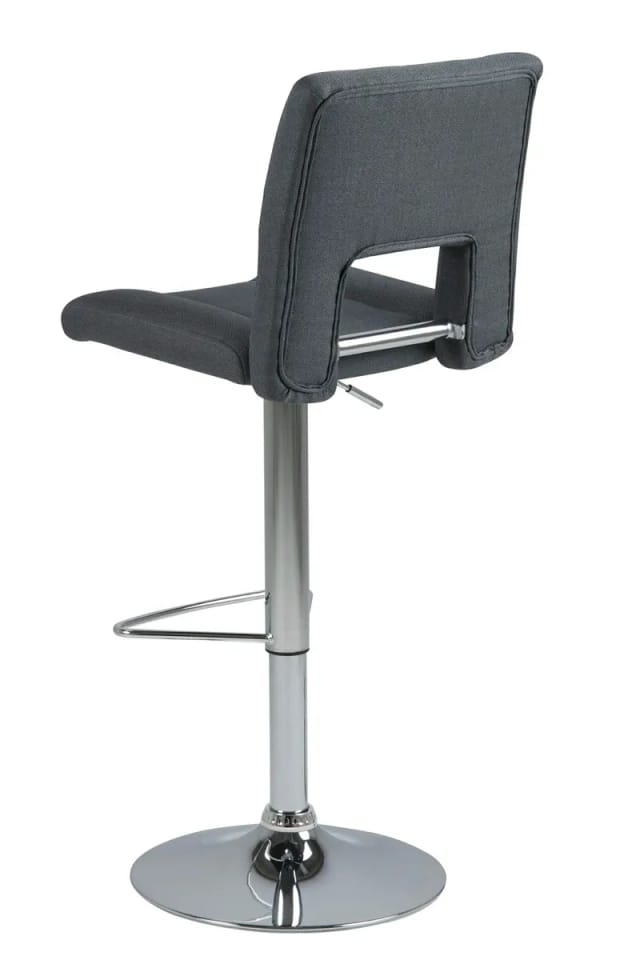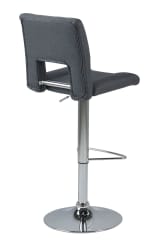 Stołek barowy Grace-6 posiada wygodne siedzisko w kolorze szarym. Wycięcie na oparciu nadaje mu stylowego wyglądu. Ustawiony na okrągłej, chromowanej podstawie, zaopatrzony jest w półokrągły podnóżek. Posiada również funkcję regulacji, co ułatwia dostosowanie wysokości siedziska do blatu stołu.