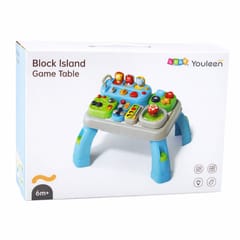 Na blacie stoliczka znajdują się różnorodne przyciski, pokrętła, klocki oraz elementy ruchome, które pobudzają ciekawość i uczą zależności przyczynowo skutkowych. Zabawka posiada funkcję dźwiękową, która dodatkowo angażuje dziecko i wzmacnia bodźce słuchowe. Różnorodność modułów sprawia, że dziecko może ćwiczyć chwytanie, naciskanie, przesuwanie oraz koordynację ręka oko.
