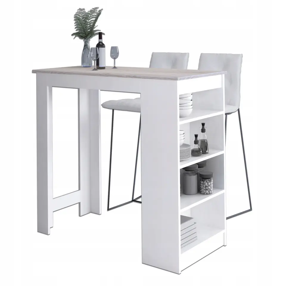 Stolik barowy pod hoker dostępny w sklepie Akord utrzymany w białym kolorze z blatem dąb sonoma będzie pasował idealnie do pomieszczeń z różnymi kolorami ścian, podłogi czy innych elementów wykończeniowych. Po jego zewnętrznej stronie umieszczone zostały półki, gdzie wygodnie przechowamy naczynia i inne akcesoria. Dopasowanie stolika do systemu mebli CLP pozwala na stworzenie dowolnej aranżacji, zgodnej z projektem lub potrzebami właściciela mieszkania.