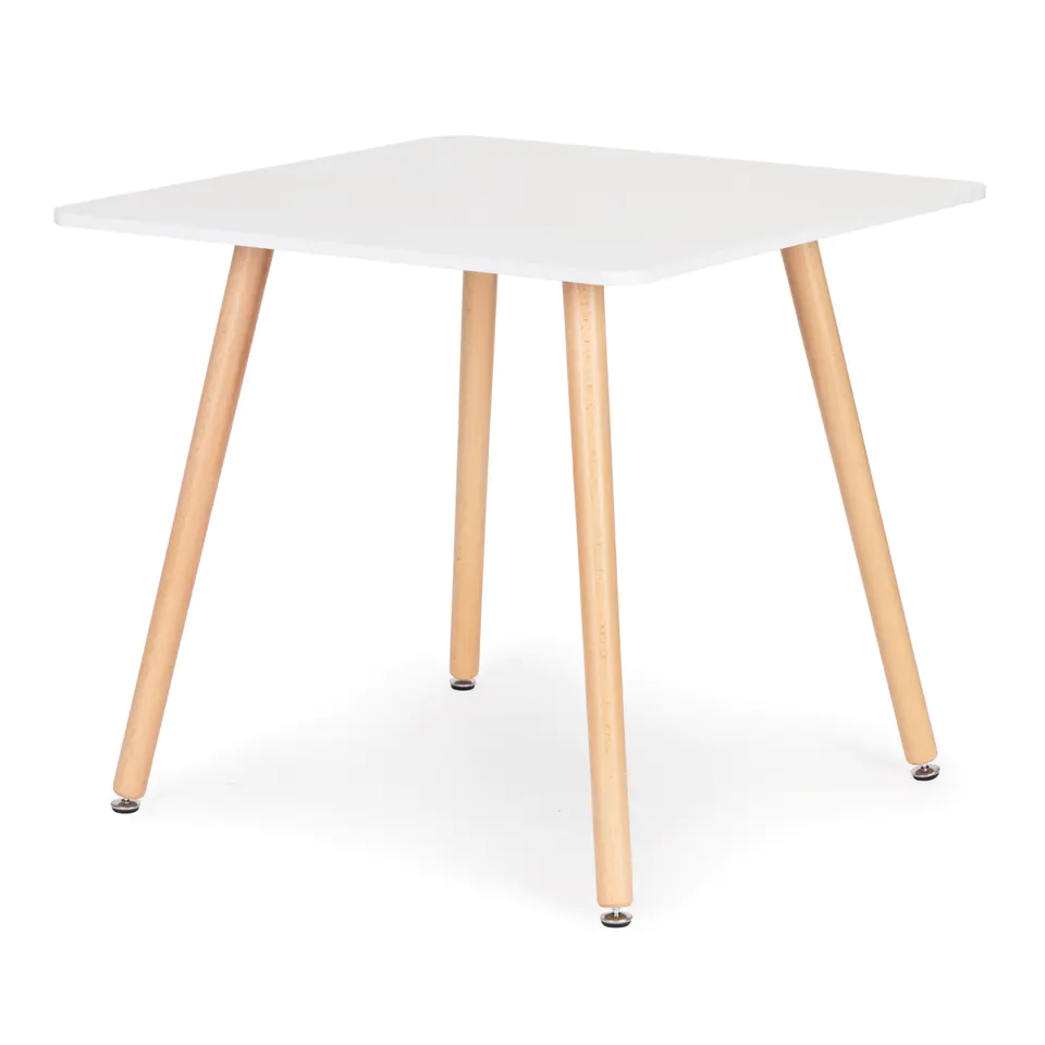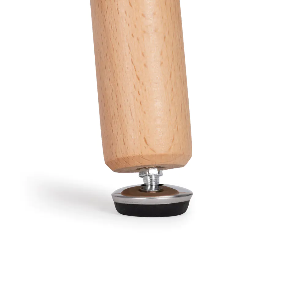 Nogi stołu wykonane są z wytrzymałego drewna bukowego, na ich końcach znajdują się specjalne, ruchome stopki, które pomogą w wypoziomowaniu stołu oraz pozwolą uniknąć zarysowań podłogi. Blat zrobiony został z płyty MDF pokrytej odporną okleiną w kolorze matowej bieli, pod nim znajduje się metalowy stelaż, w którym osadza się nogi stolika.