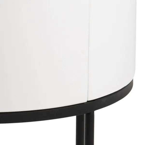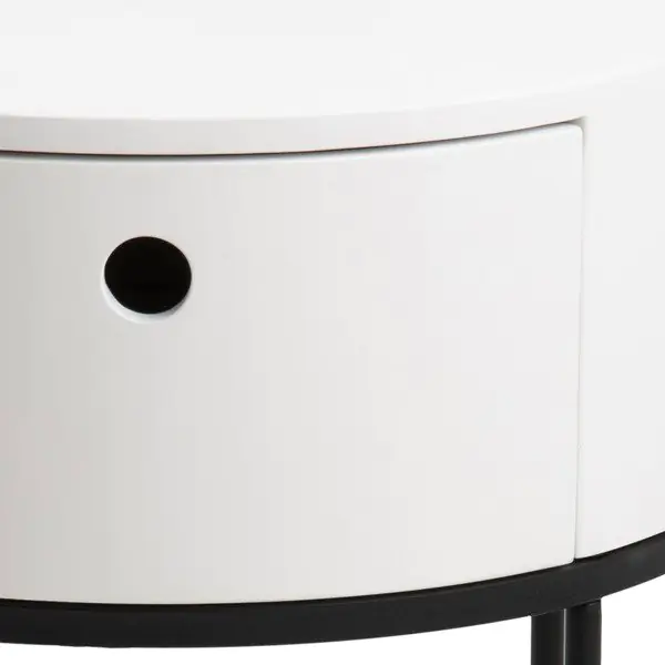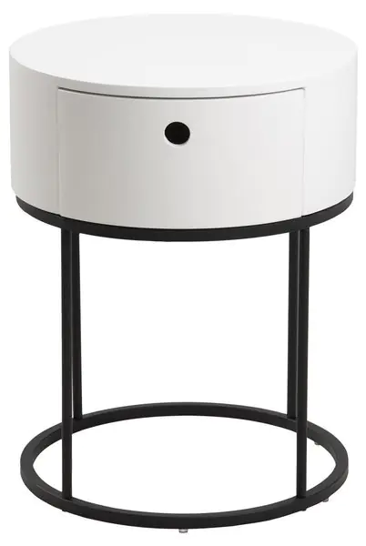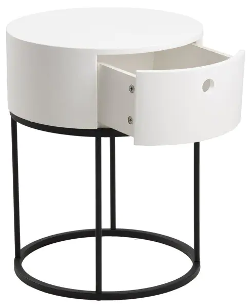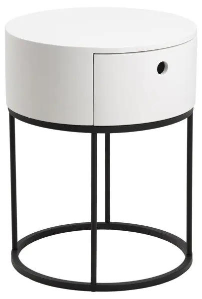 Aranżacja wnętrz w stylu nowoczesnym kładzie nacisk na prostotę oraz funkcjonalność mebli. Dotyczy to zwłaszcza sypialni, w których tak ważna jest ergonomia i oszczędność miejsca. Stolik nocny Cartagena-2 idealnie spełni to zadanie. Przez swój okrągły kształt nie zajmuje zbyt wiele miejsca, lecz nadal spełnia potrzeby praktycznego mebla sypialnianego. Jego biały blat wykonany z wytrzymałej, białej płyty MDF wznosi się na metalowej podstawie proszkowo malowanej na kolor czarny. Niewielka, choć wystarczająca, szuflada jest w stanie pomieścić wszystkie potrzebne do snu rzeczy, zaś blat może służyć za podstawę dla lampki nocnej.