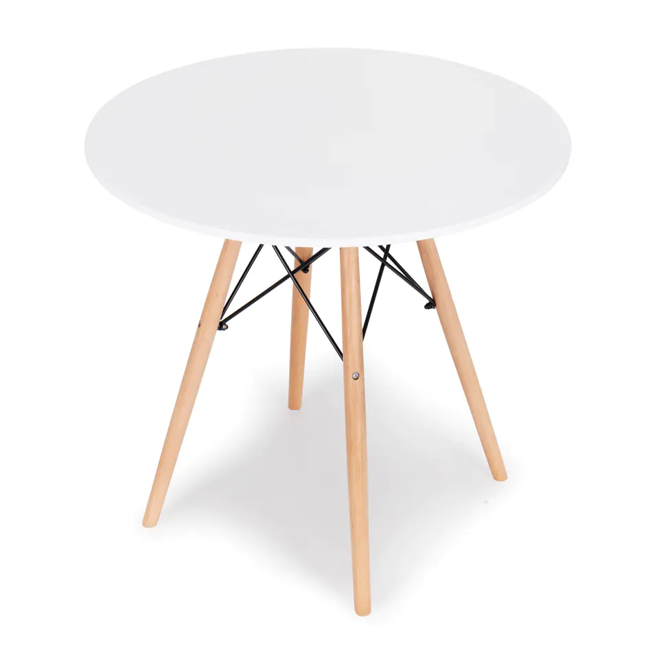 Nogi stołu wykonane są z wytrzymałego drewna bukowego i łączy je metalowy, krzyżowy stelaż, który nadaje sztywności całej konstrukcji. Blat zrobiony został z płyty MDF pokrytej odporną okleiną w kolorze matowej bieli, jego brzegi są specjalnie wyprofilowane i pozbawione ostrych krawędzi.