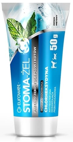 Działanie:Stoma – żel jest kosmetykiem weterynaryjnym przeznaczonym do pielęgnacji jamy ustnej. Dodatek chlorheksydyny do pasty wpływa na ograniczenie rozwoju niepożądanej mikroflory w jamie ustnej, usuwa nieprzyjemny zapach oraz utrzymuje higienę zębów i dziąseł. Dodatek smakowo-zapachowy sprawia, że zwierzęta łatwo akceptują stosowanie pasty. Środki czyszczące zapobiegają powstawaniu kamienia nazębnego oraz wytwarzają emulsję z drobinami pokarmu pozwalającą na jego usuwanie z powierzchni zębów.Wskazania:Higiena jamy ustnej i uzębienia.Stosowanie:1-2 razy w tygodniu lub codziennie w zależności od stanu uzębienia. Pastę nakładać za pomocą szczoteczki do zębów, palca lub kawałka gazy. Łagodnie wcierać. Nie wypłukiwać.Środki ostrożności:Unikać kontaktu z oczami.Skład:AQUA, CALCIUM CARBONATE, CETEARETH-33, ALUMINUM SILICATE, CHLORHEXIDINE DIGLUCONATE, TITANIUM DIOXIDE, PARFUM