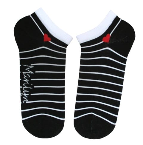Stopki damskie czarne w białe paseczki , z delikatnym serduszkiem w okolicy kostki. Wykonane z naturalnej bawełny najwyższej jakości. Płaski i miękki szew zapewni komfort noszenia. Skład: 80% bawełna, 15% poliamid, 5% elastan.