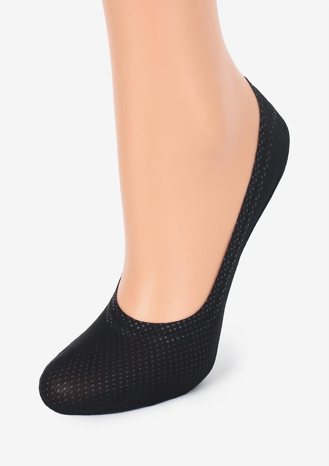 Elastyczne stopki z perforowanej dzianiny wykończone są bezszwowo. Zapobiegają obtarciom, nie zsuwają się, dzięki silikonowi na brzegach oraz zapiętku. Spód bawełniany z antypoślizgowymi kwiatkami. Skład: 53% poliamid, 36% bawełna, 11% elastan.