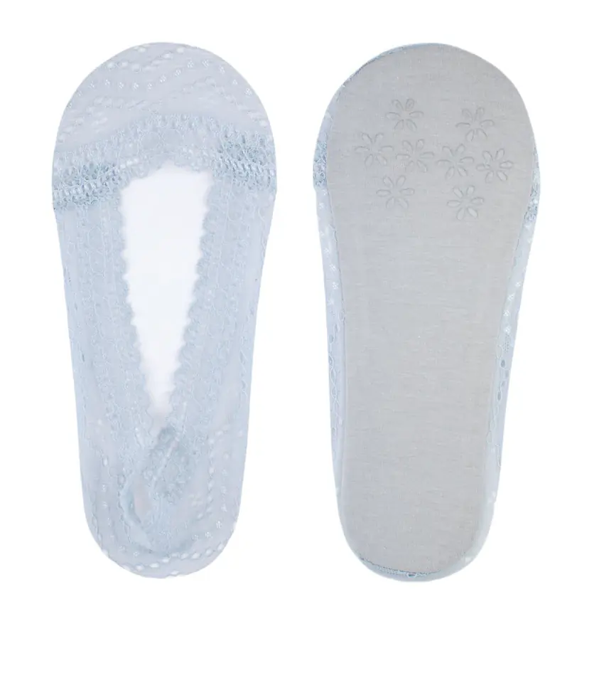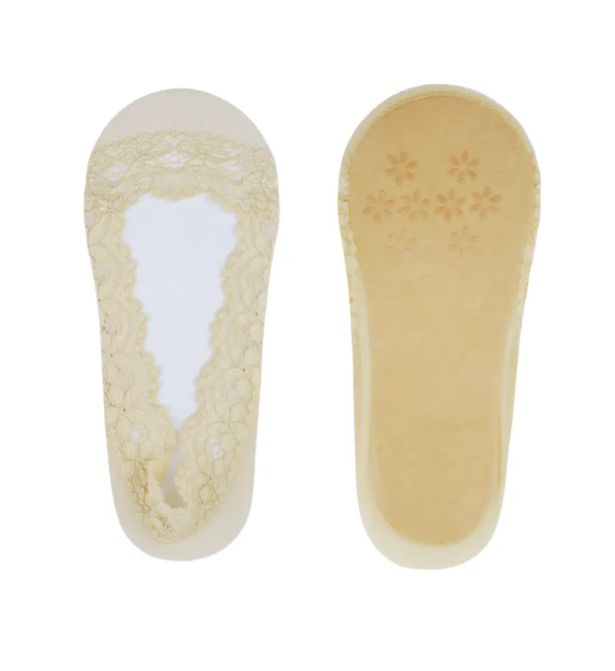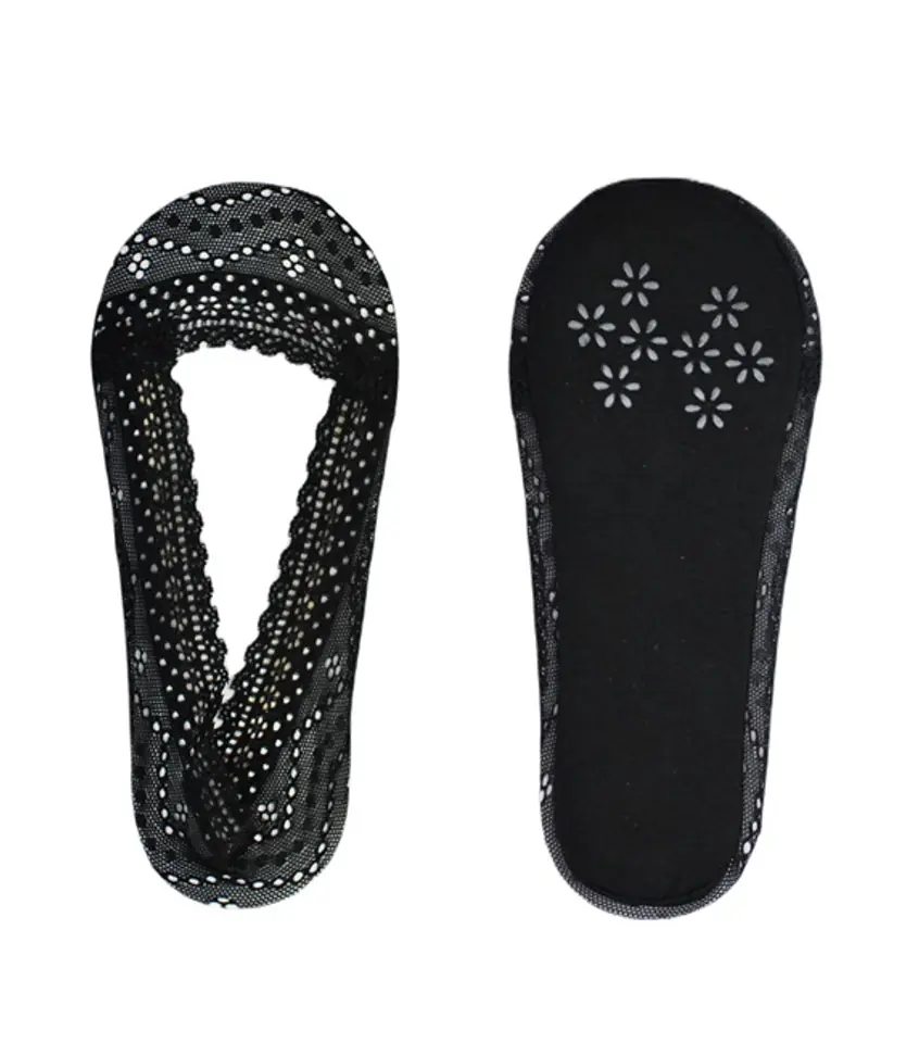 Balerinki damskie koronkowe z silikonem na pięcie. Na bawełnianej podeszwie silikonowe kwiatki. Skład surowcowy: wierzch 87% poliamid, 13% elastan; podeszwa 95% bawełna, 5% elastan.