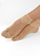Skarpetki damskie z siateczki i koronki, ściągacz i palce z ozdobną koronką, podeszwa z gładkiej bawełny. Skład: wierzch 77% poliamid, 23% elastan; podeszwa 93% bawełna, 7% elastan.