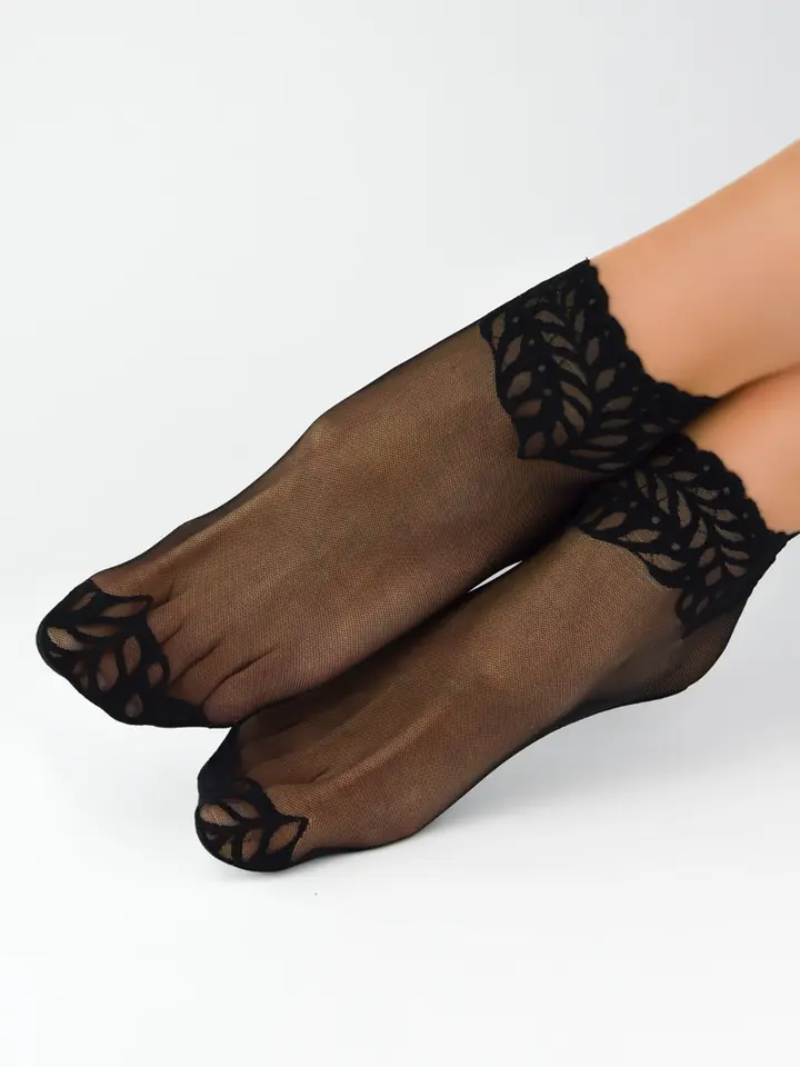 Skarpetki damskie z siateczki i koronki, ściągacz i palce z ozdobną koronką, podeszwa z gładkiej bawełny. Skład: wierzch 77% poliamid, 23% elastan; podeszwa 93% bawełna, 7% elastan.