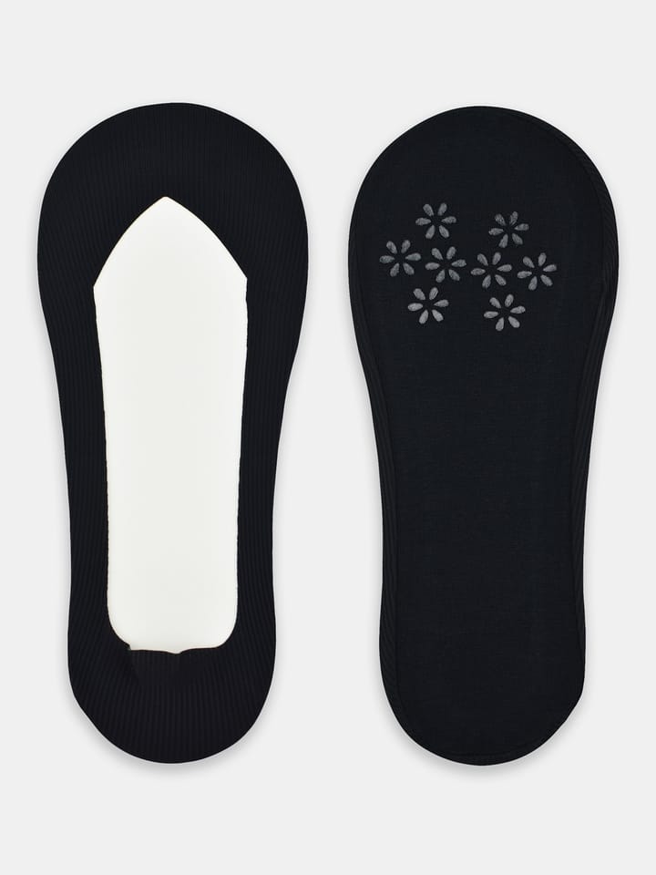 Balerinki damskie laserowo cięte z silikonem. Na bawełnianej podeszwie silikonowe kwiatki. Skład surowcowy: wierzch 73% poliamid, 27% elastan; podeszwa 95% bawełna, 5% elastan.