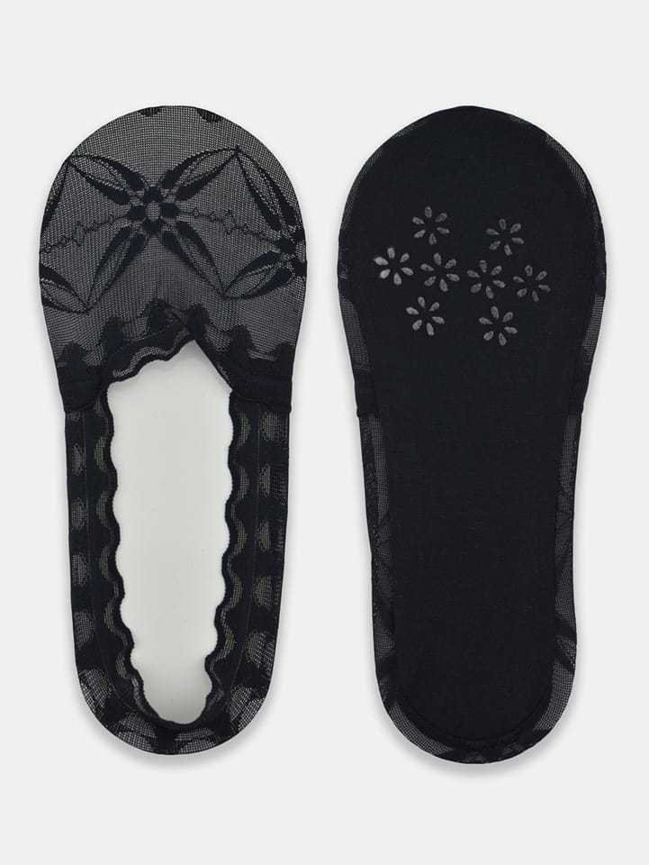 Balerinki damskie z koronki. Ściągacz posiada pasek silikonu, który zapobiega zsuwaniu, podeszwa z gładkiej bawełny z silikonowymi kwiatkami. Skład: wierzch 83% poliamid, 17% elastan; podeszwa 95% bawełna, 5% elastan.