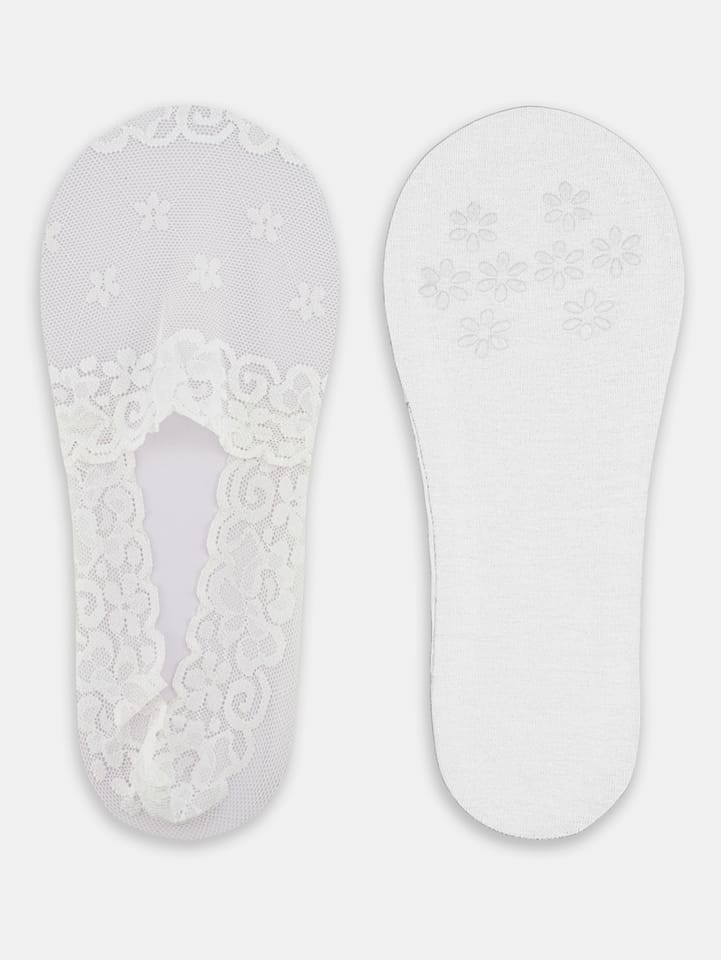 Balerinki damskie z koronki. Ściągacz posiada pasek silikonu, który zapobiega zsuwaniu, podeszwa z gładkiej bawełny z silikonowymi kwiatkami. Skład: wierzch 83% poliamid, 17% elastan; podeszwa 95% bawełna, 5% elastan.