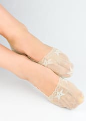 Balerinki damskie z mikrofibry, ściągacz z paskiem silikonu, zapobiega zsuwaniu, podeszwa z gładkiej bawełny z ABS. Skład: wierzch 83% poliamid, 17% elastan; podeszwa 93% bawełna, 7% elastan.