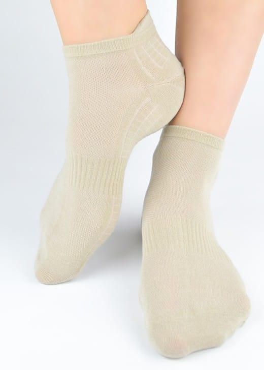 Zakostki sportowe ze ściągaczem w środstopiu zapobiegającym zsuwaniu. Posiadają strefy wentylacyjne, zapiętek z "języczkiem" i wyprofilowaną piętę. Bardzo elastyczne, przyjemne w dotyku. Skład: 77% bawełna, 20% poliamid, 3% elastan.
