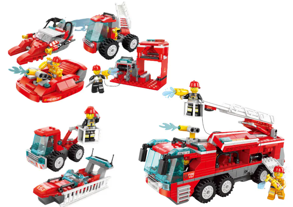 Zestaw klocków konstrukcyjnych z motywem wozów straży pożarnej, który zapewni dzieciom godziny kreatywnej zabawy i edukacji. Zestaw zawiera różnorodne wzory pojazdów straży pożarnej, w tym motory, łodzie, samoloty oraz pojazdy terenowe, które pomogą młodym konstruktorom odkryć świat służb ratowniczych.