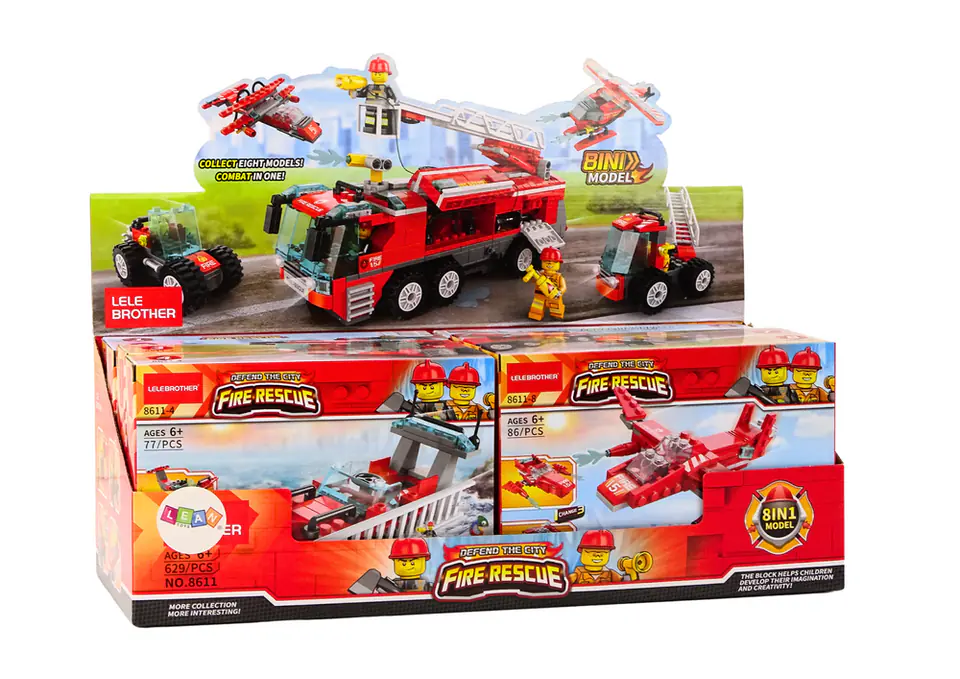 W jednym opakowaniu zbiorczym znajduje się 8 różnych wzorów. Każdy zestaw jest indywidualnie zapakowany, co ułatwia przechowywanie i organizację. Układanie klocków z motywem wozów straży pożarnej rozwija zdolności manualne, kreatywność oraz wyobraźnię przestrzenną dzieci. Tworzenie modeli pojazdów straży pożarnej może także pomóc w zrozumieniu roli i znaczenia służb ratowniczych.