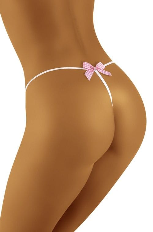 Kuszące stringi z kokardką nad pośladkami. Frywolne i uwodzicielskie, idealne na lato. Przód z miękkiej, lekko prążkowanej dzianiny. Skład: 83% poliamid, 17% elastan.