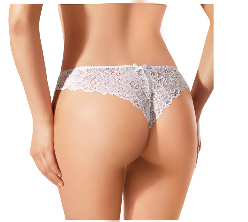 Zmysłowe, koronkowe stringi, które pięknie zdobią pośladki. Kwiecista aranżacja wygląda wyjątkowo stylowo. Fajny, seksowny fason. Przód bielizny wykonany jest z gładkiego tiulu, który pokryto subtelnymi, błyszczącymi cyrkoniami.