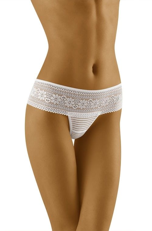 Zjawiskowe, koronkowe stringi, które od razu wpadają w oko. Kwieciste, nieco romantyczne. Z tyłu subtelne paseczki i satynowa kokardka. Skład: 83% poliamid, 17% elastan.