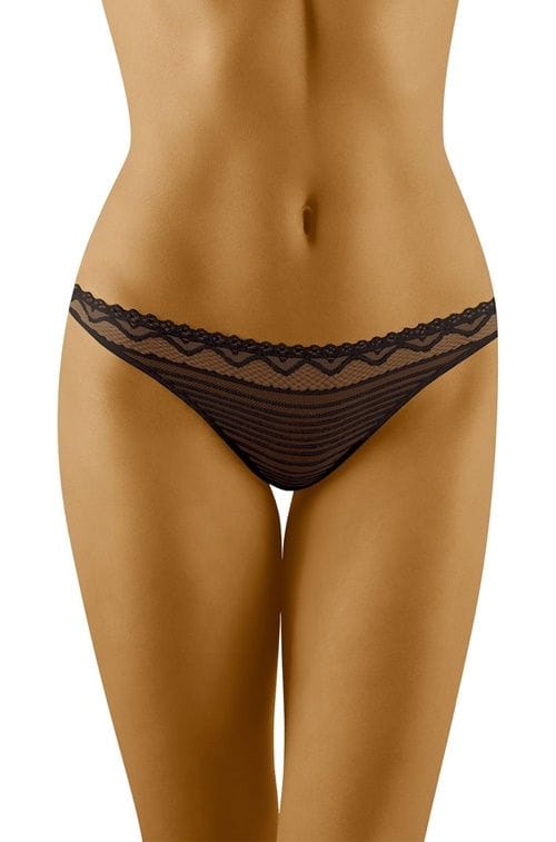 Zjawiskowe, lekko prześwitujące stringi z kokardką nad pośladkami. Przód zdobiony ażurową tkaniną w dekoracyjny prążek. Skład: 83% poliamid, 17% elastan.