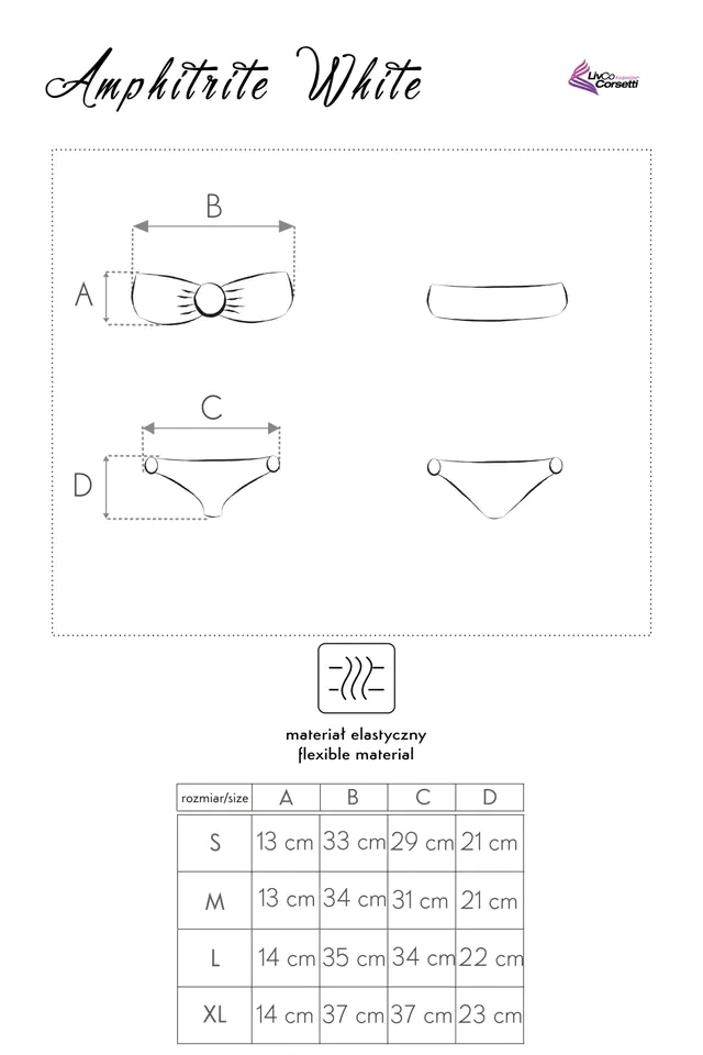 Dwuczęściowy strój kąpielowy przyciąga uwagę przede wszystkim nawiązaniem do formy stanika typu „bardotka”, subtelnym charakterem i ciekawym zastosowaniem kolistych połączeń części tylnej i przedniej na biodrach oraz między miseczkami. Marszczenia materiału na biustonoszu optycznie powiększają biust oraz stanowią element dekoracyjny. Biustonosz pozwala odsłonić ramiona i plecy. Budząca zmysły biel podkreśli nieokiełznany temperament, kobiecą zmysłowość i siłę.