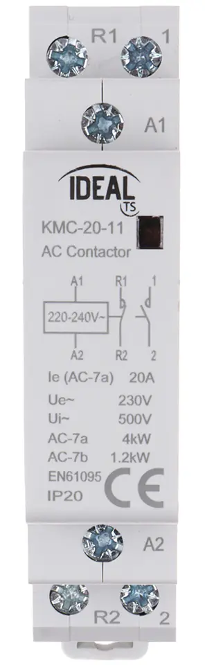 Stycznik KMC-20-11 posiada 1 styk zwierny i 1 styk rozwiernyZarówno napięcie sterowania jak i zasilania wykorzystuje prąd zmiennyUrządzenie nie posiada manipulatora do obsługi manualnej