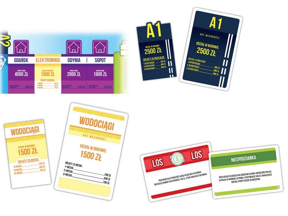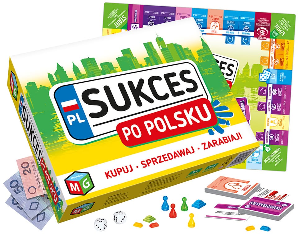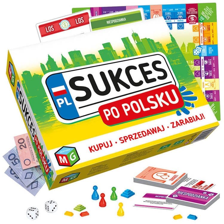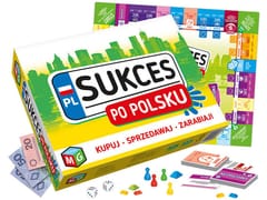 Witaj w świecie “SUKCESU PO POLSKU”! Zostań inwestoremi zasiądź do gry planszowej, w której przekonasz sie, czy masz żyłkę biznesową. Dokonuj zakupów działek miejskich, bierz udziałw inwestycjach i rozwijaj zakupione posesje. Obierz własną strategię: graj impulsywnie lub ostrożnie i planowo. Gra jestświetną rozrywką dla osób w każdym wieku. Zaznajamia graczy z polskimi miastami, uczy strategicznego planowania i taktycznegomyślenia. Zatem nie zwlekaj - wejdź na rynek i zdobądź fortunę!plansza - 1szt, pionki - 4szt, kartyDOWÓD WŁASNOŚCI - 20szt,karty ZAWÓD - 5szt, kartyNIESPODZIANKA - 30szt, kostki -2szt, czeki - 70szt, banknoty - 150szt,elementy inwestycji - cegiełki- 45szt, elementy inwestycji -piramidki - 15szt, instrukcja.