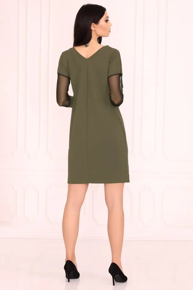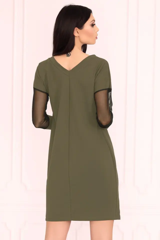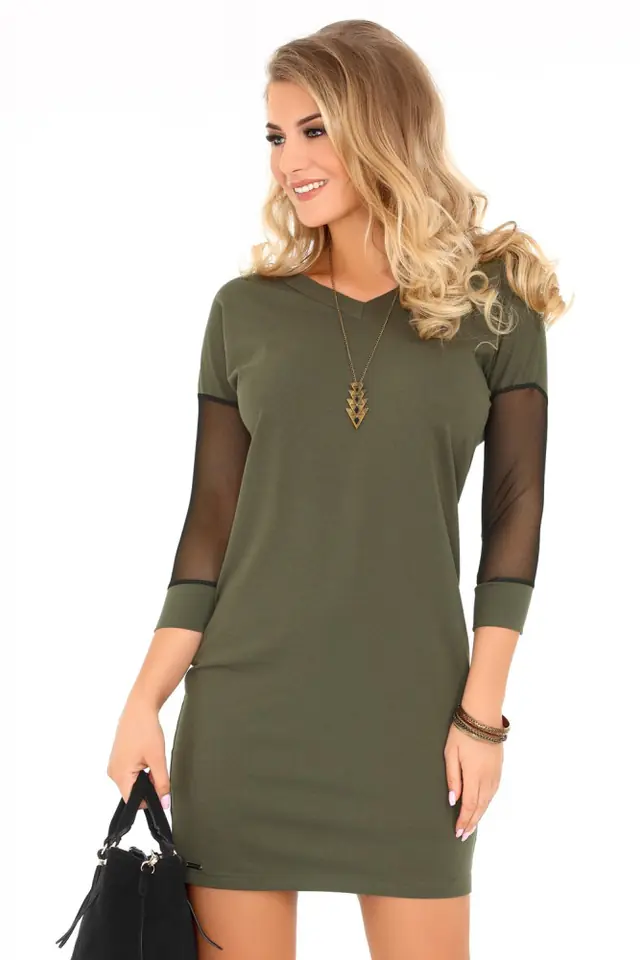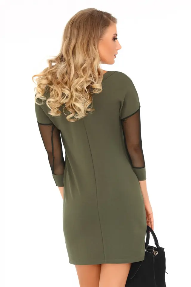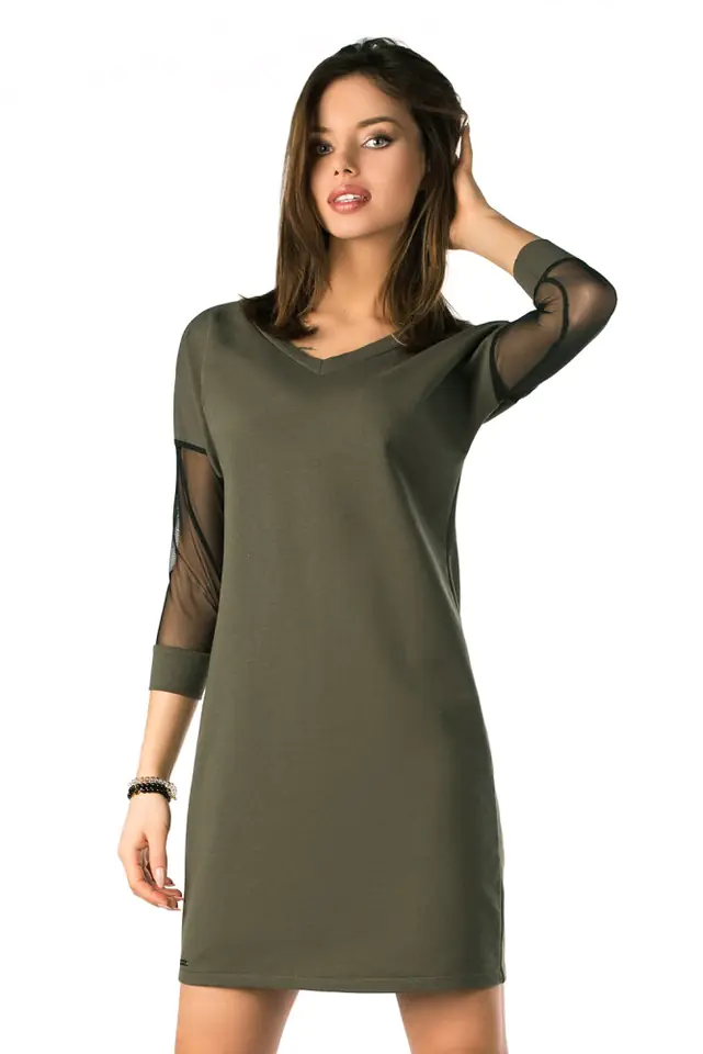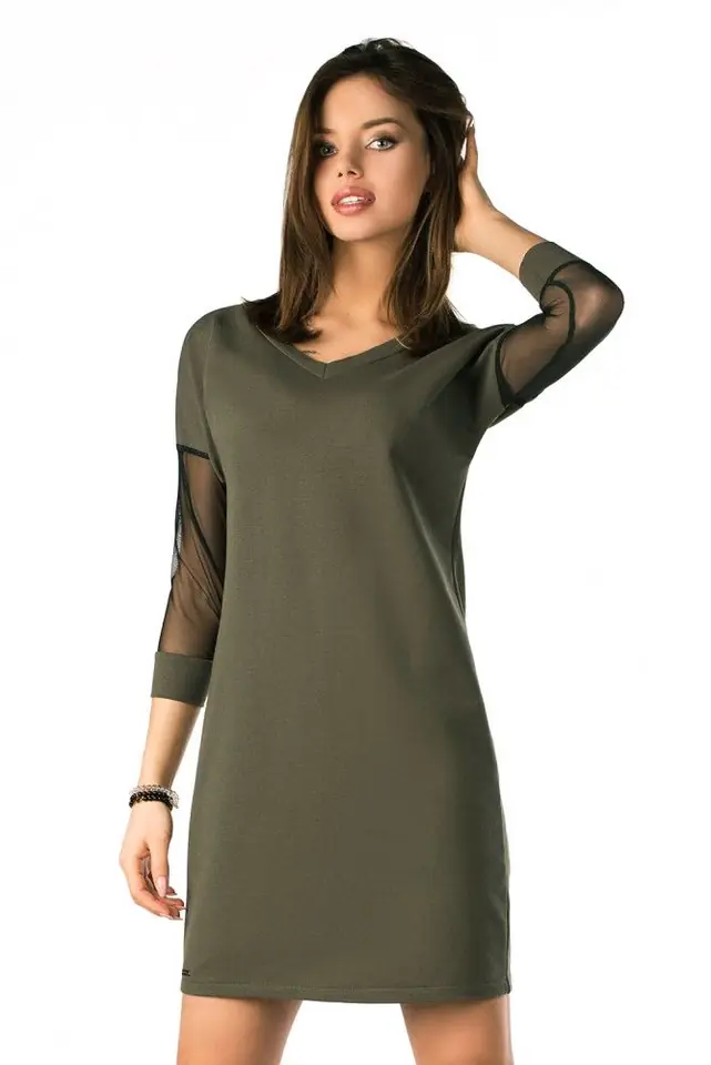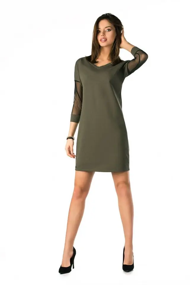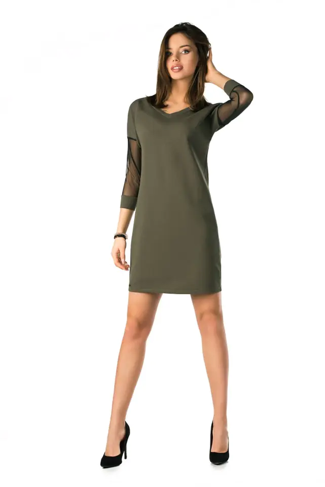 Elegancka, uniwersalna sukienka z miękkiej dzianiny z dodatkiem bawełny. Zdobiona tiulowymi rękawami. Prosty, zgrabny krój, który ładnie podkreśla rysy ciała. Rękawy o długości 3/4. Jeśli szukasz czegoś co swobodnie połączyć możesz zarówno ze szpilkami, balerinami jak i trampkami - ta sukienka będzie idealna. Skład: 70% bawełna, 25% poliester, 5% elastan.