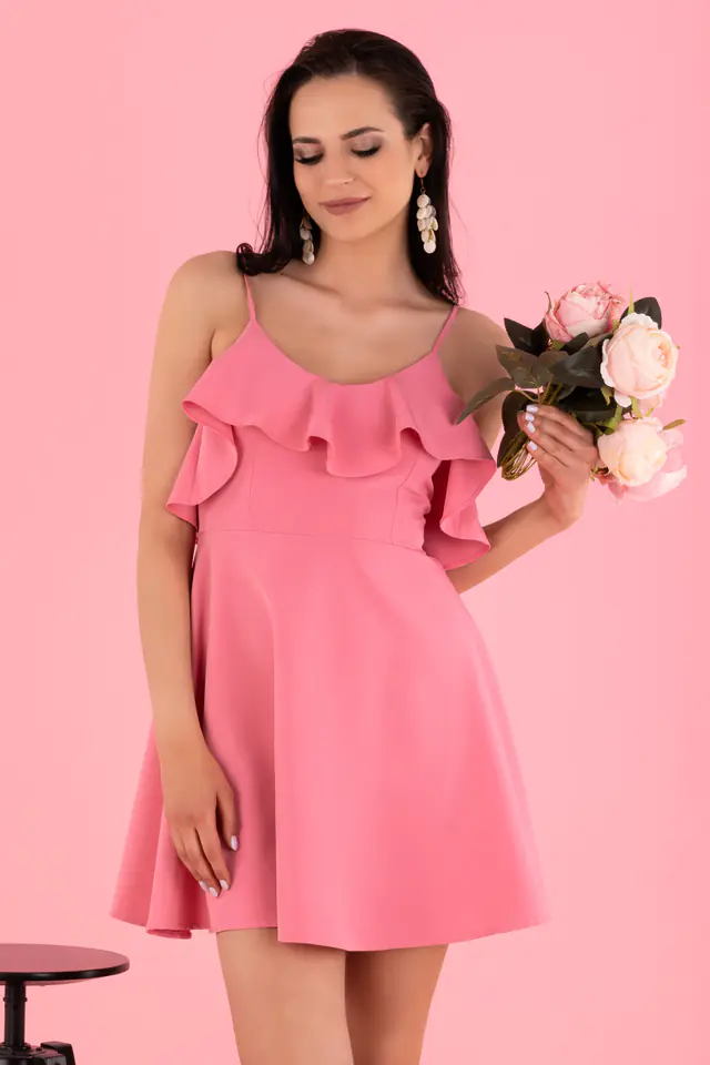 Sukienka Cooreo w kolorze różowym dostępna jest w czterech rozmiarach: S, M, L, XL. Skład materiałowy to 95% POLYESTER 5% ELASTANE