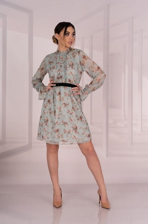 Efektowna, miętowa sukienka wykonana z delikatnej, zwiewnej tkaniny w kwiaty. Na komfortowej podszewce, rękawy długie, ozdobnie wykończone przy nadgarstkach. Dekolt z mini falbanką, zabudowany. Skład: 95% poliester, 5% elastan.