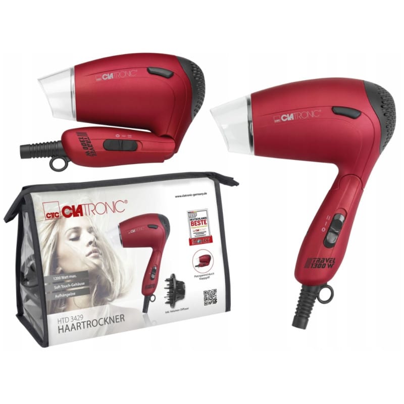 NAJWYŻSZEJ JAKOŚCIKOMPAKTOWA SKŁADANASUSZARKA DO WŁOSÓWRENOMOWANEJ FIRMY CLATRONICMODEL: HTD 3429 CZERWONAKompaktowa suszarka AEG HTD 5674 sprawi, że będziesz mogła zadbać o swoją fryzurę w odpowiedni sposób bez względu na to, gdzie się znajdujesz.Dzięki rozmiarom i składanemu uchwytowi możesz jej używać nie tylko w domu, ale wszędzie tam, dokąd wyjedziesz.Piękne włosy to marzenie każdej kobiety. Dzięki suszarce HTD 3429 ułożysz zarówno prostą, ale subtelną fryzurę, jak i skomplikowaną oraz niezwykle efektowną.Urządzenie jest niezwykle poręczne i ergonomiczne za sprawą odpowiedniego wyprofilowania oraz miękkiego uchwytu. Kompaktowa obudowa i składana rączka sprawiają, że suszarka bez problemu zmieści się w walizce, a nawet w torebce.Moc 1300 W zapewnia delikatne suszenie i pozwala uzyskać piękne rezultatyTa suszarka do włosów o mocy 1300 W generuje strumień powietrza o optymalnym natężeniu oraz delikatną moc suszenia, dzięki czemu każdego dnia możesz cieszyć się pięknymi włosami.Kompaktowe wymiary ułatwiają obsługę i przenoszenieTa kompaktowa i ergonomiczna suszarka wykorzystuje pomysłowe, nowoczesne wzornictwo. Dzięki temu jest lekka i łatwa w użyciu.Suszarka jest wyposażona w składany uchwyt dzięki czemu z łatwością zmieści się w najciaśniejszych miejscach i można ją zabrać ze sobą praktycznie wszędzie.Najważniejsze cechy suszarki do włosów HTD 3429:Kompaktowa suszarka do włosówPrzyjemna w dotyku gumowana obudowa2 stopnie temperatury/poboru mocySkładany uchwytPrzełączalne napięcie zasilania: 110/230 VDysza formująca, dająca się przekręcić o 360° i zdjąćZ dyfuzorem do zwiększania objętości włosów i przezroczystą saszetką do praktycznego przechowywania suszarki i na podróżPętelka do zawieszeniaZasilanie napięciowe: 110/230 V, 50/60 HzPobór mocy: 1300W maks.Kompaktowe wymiaryDzięki rozmiarom i składanemu uchwytowi możesz jej używać nie tylko w domu, ale wszędzie tam, dokąd wyjedzieszBogaty zestaw akcesoriówW skład zestawu wchodzi dyfuzor do zwiększania objętości włosów, dysza formująca oraz saszetka do przechowywaniaErgonomiaPrzyjemna w dotyku, gumowana obudowa zapewnia dobry chwyt i bezpieczeństwo użytkowaniaIdealny na prezentUrządzenie posiada eleganckie opakowanie, dzięki czemu idealnie sprawdzi się, jako prezent!Wymiary suszarki:Wymiary (ok. szer. x wys. x gł.) i wagaUrządzenie: 170 x 235 x 75 mm; 0.35 kgOpakowanie: 170 x 240 x 80 mm; 0.45 kgslimtex