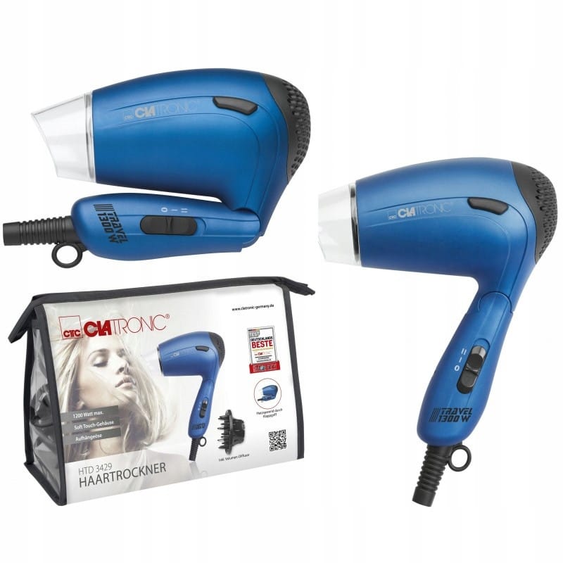 NAJWYŻSZEJ JAKOŚCIKOMPAKTOWA SKŁADANASUSZARKA DO WŁOSÓWRENOMOWANEJ FIRMY CLATRONICMODEL: HTD 3429 NIEBIESKAKompaktowa suszarka HTD 3429 sprawi, że będziesz mogła zadbać o swoją fryzurę w odpowiedni sposób bez względu na to, gdzie się znajdujesz.Dzięki rozmiarom i składanemu uchwytowi możesz jej używać nie tylko w domu, ale wszędzie tam, dokąd wyjedziesz.Piękne włosy to marzenie każdej kobiety.Dzięki suszarce HTD 3429 ułożysz zarówno prostą, ale subtelną fryzurę, jak i skomplikowaną oraz niezwykle efektowną.Urządzenie jest niezwykle poręczne i ergonomiczne za sprawą odpowiedniego wyprofilowania oraz miękkiego uchwytu. Kompaktowa obudowa i składana rączka sprawiają, że suszarka bez problemu zmieści się w walizce, a nawet w torebce.Moc 1300 W zapewnia delikatne suszenie i pozwala uzyskać piękne rezultatyTa suszarka do włosów o mocy 1300 W generuje strumień powietrza o optymalnym natężeniu oraz delikatną moc suszenia, dzięki czemu każdego dnia możesz cieszyć się pięknymi włosami.Kompaktowe wymiary ułatwiają obsługę i przenoszenieTa kompaktowa i ergonomiczna suszarka wykorzystuje pomysłowe, nowoczesne wzornictwo. Dzięki temu jest lekka i łatwa w użyciu.Suszarka jest wyposażona w składany uchwyt dzięki czemu z łatwością zmieści się w najciaśniejszych miejscach i można ją zabrać ze sobą praktycznie wszędzie.Najważniejsze cechy suszarki do włosów HTD 3429:Kompaktowa suszarka do włosówPrzyjemna w dotyku gumowana obudowa2 stopnie temperatury/poboru mocySkładany uchwytPrzełączalne napięcie zasilania: 110/230 VDysza formująca, dająca się przekręcić o 360° i zdjąćZ dyfuzorem do zwiększania objętości włosów i przezroczystą saszetką do praktycznego przechowywania suszarki i na podróżPętelka do zawieszeniaZasilanie napięciowe: 110/230 V, 50/60 HzPobór mocy: 1300W maks. Kompaktowe wymiaryDzięki rozmiarom i składanemu uchwytowi możesz jej używać nie tylko w domu, ale wszędzie tam, dokąd wyjedzieszBogaty zestaw akcesoriówW skład zestawu wchodzi dyfuzor do zwiększania objętości włosów, dysza formująca oraz saszetka do przechowywaniaErgonomiaPrzyjemna w dotyku, gumowana obudowa zapewnia dobry chwyt i bezpieczeństwo użytkowaniaIdealny na prezentUrządzenie posiada eleganckie opakowanie, dzięki czemu idealnie sprawdzi się, jako prezent!Wymiary suszarki:Wymiary (ok. szer. x wys. x gł.) i wagaUrządzenie: 170 x 235 x 75 mm; 0.35 kgOpakowanie: 170 x 240 x 80 mm; 0.45 kgslimtex