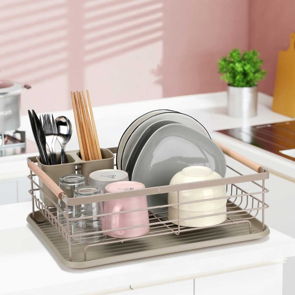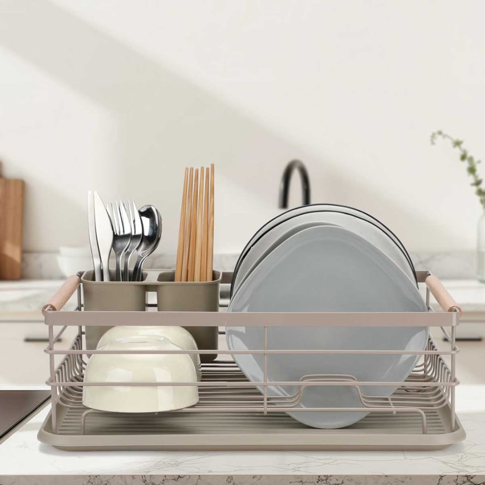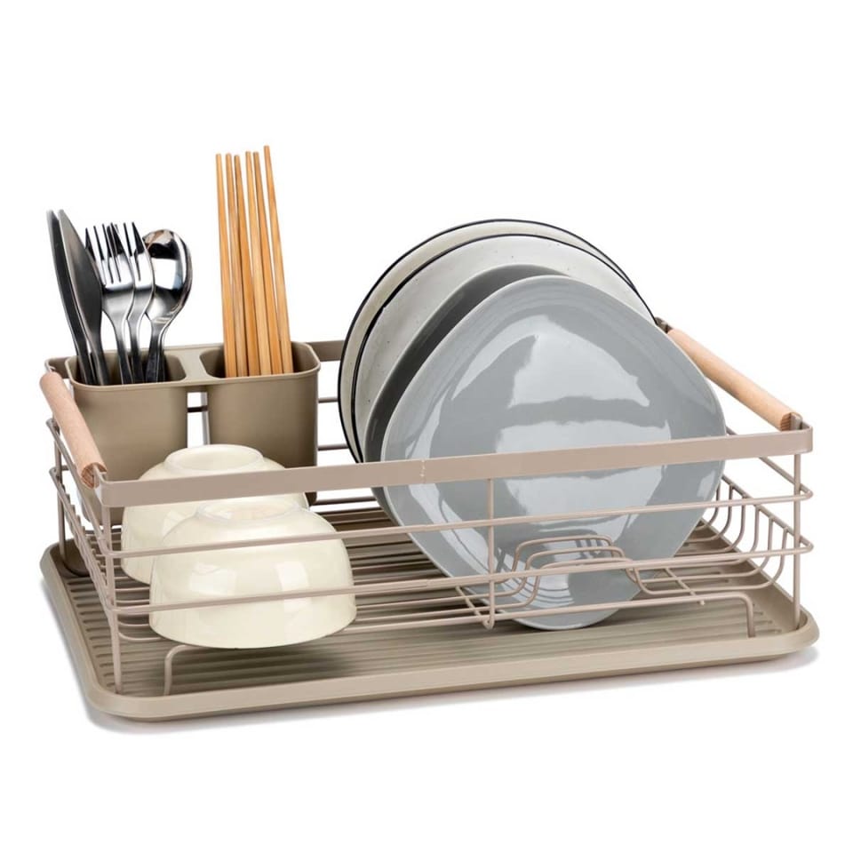 Suszarka do naczyń z ociekaczem i tacą – korzyści - Metalowa konstrukcja z powłoką proszkową zapewnia trwałość i odporność na korozję, co przekłada się na długotrwałe użytkowanie bez śladów zużycia.