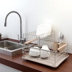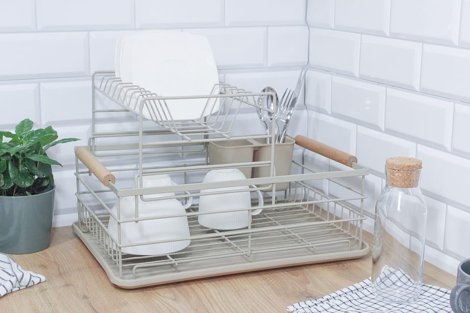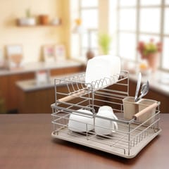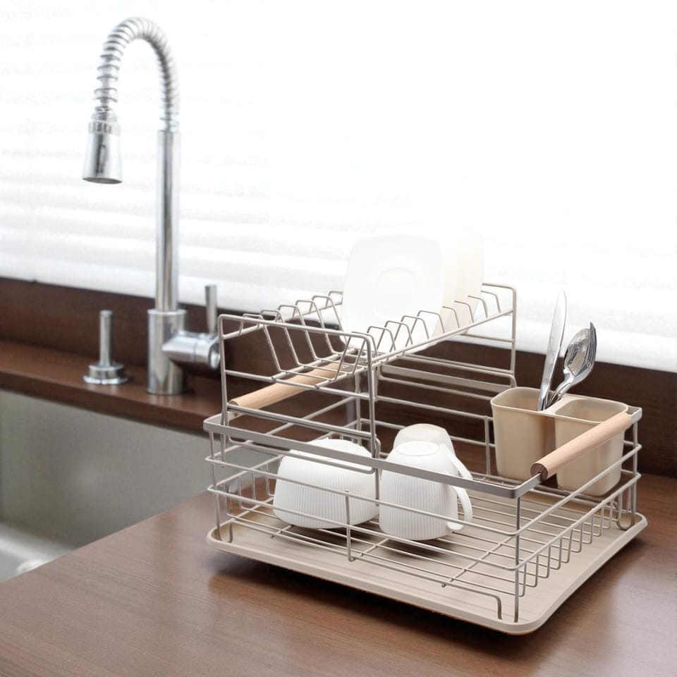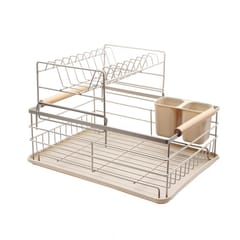 Suszarka do naczyń dwupoziomowa beżowa z ociekaczem na sztućce i tacą