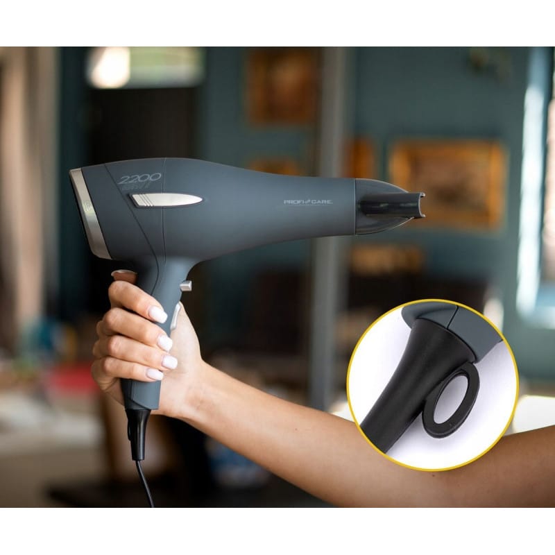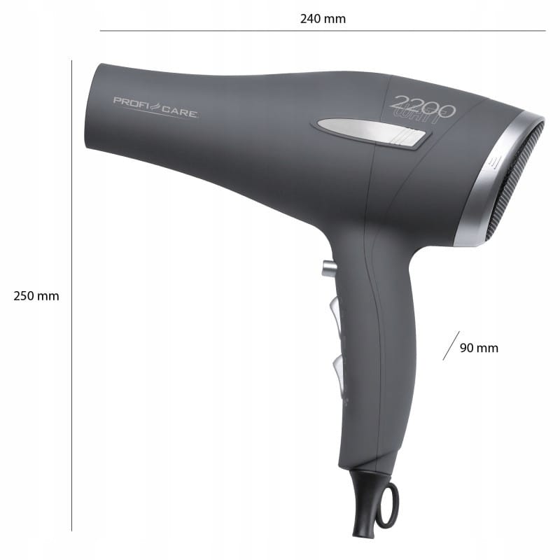NAJWYŻSZEJ JAKOŚCIPROFESJONALNA SUSZARKADO WŁOSÓWRENOMOWANEJ FIRMY PROFICAREmodel: PC-HT 3045 SZARASuszarka do włosów Proficare to urządzenie, które doskonale sprawdzi się w domu każdej osoby, która ceni sobie czas i zadbany wygląd.Posiada dużą moc, dzięki której włosy zostaną wysuszone szybko i efektywnie.Jednocześnie wydajna i trwała, dzięki wykorzystaniu wysokiej jakości materiałów. Różne stopnie siły nadmuchu pozwalają regulować prędkość suszenia włosów, w zależności od potrzeb. Suszarka posiada ergonomiczną rączkę oraz jest lekka, co sprawia, że jest wygodna w codziennym użytkowaniu. Możliwość złożenia rączki ułatwia przechowywanie i przewożenie suszarki.Nasza suszarka wyróżnia się dużą mocą 2200W. Gwarantuje to szybkie wysuszenie nawet bardzo mokrych włosów bez szkody dla ich struktury. Doceni to każdy właściciel grubych i gęstych kosmyków! Rano liczy się każda minuta przed wyjściem do pracy! Koncentrator zadba, aby powietrze skupiało się na wybranym pasmie włosów, co dodatkowo ułatwia wykończenie fryzury. Proste wzornictwo i elegancki design spodoba się każdemu! Dzięki niewielkim rozmiarom oraz poręczności suszarkę można zabrać w każdą podróż i nie zajmie ona wiele miejsca w bagażu. Składana rączka ułatwi jej przechowywanie.Profesjonalna moc 2200W pozwala uzyskać efekty jak w salonieTa profesjonalna suszarka o mocy 2200W zapewnia silny nadmuch. Połączenie mocy i prędkości sprawia, że suszenie i układanie włosów jest szybsze i prostsze.Zimny nadmuch pozwala utrwalić fryzuręProfesjonaliści nie obędą się bez funkcji przycisku Cool Shot, który umożliwia korzystanie z intensywnego nadmuchu zimnego powietrza. Używa się go po ułożeniu włosów w celu wykończenia fryzury i nadania jej ostatecznego kształtu.Doskonałe efekty modelowania dzięki wąskiej nasadceDoskonałe rezultaty i lśniące, zadbane włosy dzięki wąskiej nasadce do precyzyjnego modelowania.Zaczep do zawieszania pozwala na wygodne przechowywaniePokryty gumą zaczep znajdujący się na podstawie uchwytu pozwala na zawieszenie urządzenia, co jest szczególnie przydatne w domu lub podczas pobytu w hotelu.DANE TECHNICZNE:Profesjonalna suszarka do włosów o maksymalnej mocy 2200 W.3 ustawienia temperatury / mocy2 ustawienia prędkościZaw. dysza kształtująca (obracana o 360 ° i wyjmowana)Miękka w dotyku obudowaFiltr wlotu powietrza (wymienny)W tym 2 zapasowe filtryOchrona przed przegrzaniemWisząca pętla220–240 V, 50/60 Hz, 1800–2200 W.SLIMTEX