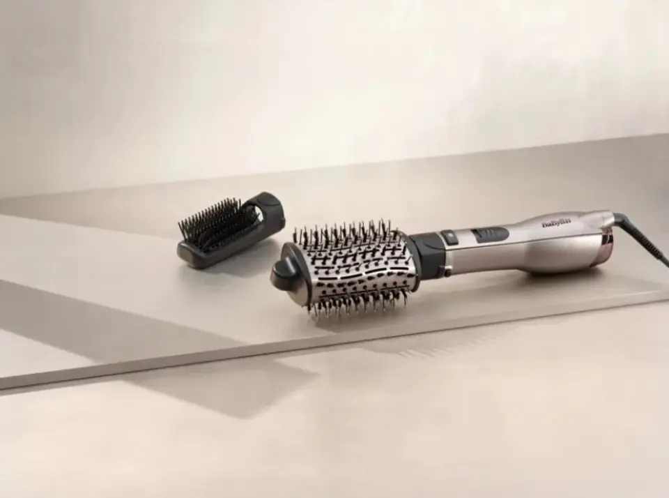 - 2 wymienne końcówki: owalna turmalinowo-ceramiczna szczotka, wygładzająca szczotka do suszenia włosów