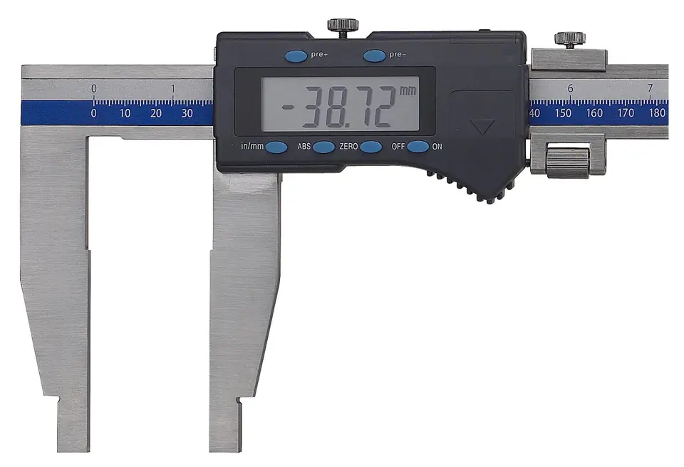 Suwmiarka cyfrowa. Ze stali nierdzewnej. Funkcja wartości Maks/Min. Funkcja HOLD. Wybór wskazania w mm lub calach. Nastawianie wartości odniesienia. Śruba dokładnego nastawiania. DIN 862. W załączeniu bateria typu CR2032.