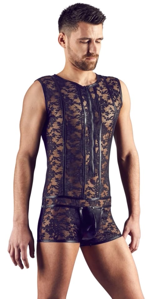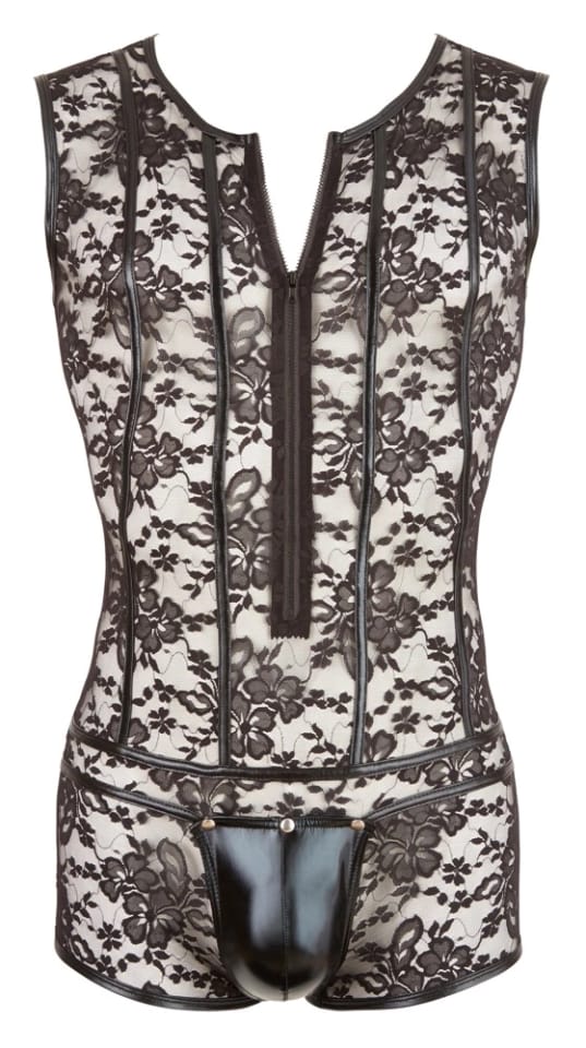 Odkryj unikatowe body męskie Svenjoyment w rozmiarze XL, ktore wyrożnia się efektownym połączeniem elastycznej, kwiecistej koronki o głębokiej czerni z modnymi, wąskimi paskami wetlook. Przod modelu wyposażono w praktyczny zamek błyskawiczny, co ułatwia zakładanie i zdejmowanie oraz podkreśla jego nowoczesny charakter.