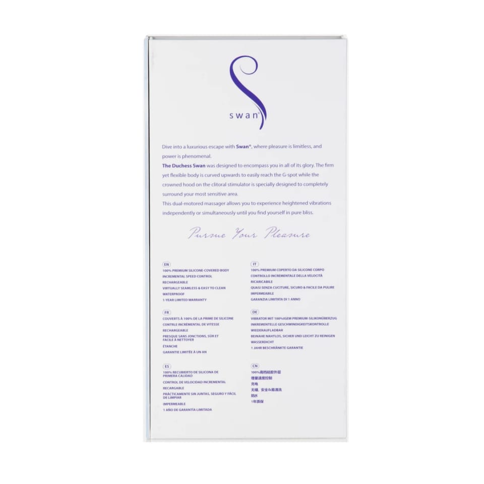 Swan The Dutchess Swan to wyrafinowany model z prestiżowej linii masażerow, zaprojektowany z myślą o najwyższych standardach jakości i komfortu. Wyrożnia się nowoczesnym designem oraz doskonale dopracowaną ergonomią, zapewniając precyzyjne dopasowanie do anatomicznych potrzeb. Model ten wyposażono w dwa niezależne silniczki PowerBullet, ktore oferują szeroki zakres ustawień, umożliwiając wybor spośrod 4 trybow i 3 poziomow intensywności pracy w każdej z końcowek. Dzięki temu możliwe jest indywidualne dopasowanie działania urządzenia.