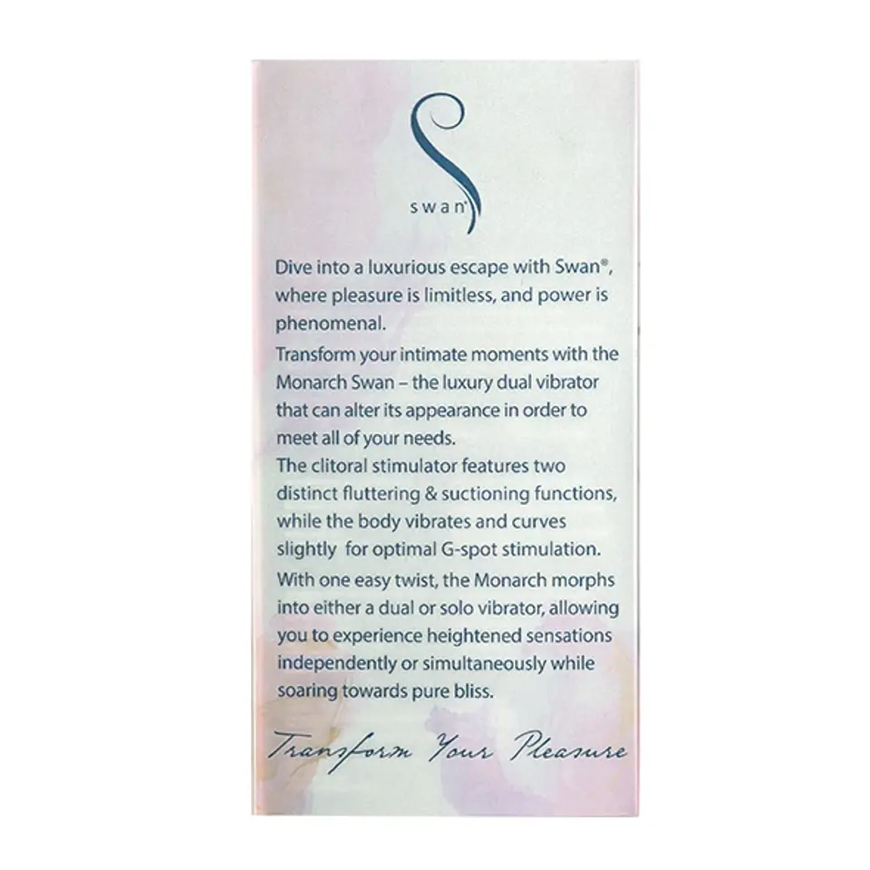 Swan The Monarch Swan to wszechstronny, zaawansowany technologicznie model, ktory wyrożnia się funkcjonalnością oraz wykonaniem z wysokiej jakości silikonu klasy premium. Turystyczny design oraz możliwość przekształcenia urządzenia z eleganckiej rożdżki w anatomiczny stymulator o kształcie litery C sprawiają, że odpowiada na rożnorodne potrzeby użytkowniczek ceniących innowacje i komfort.